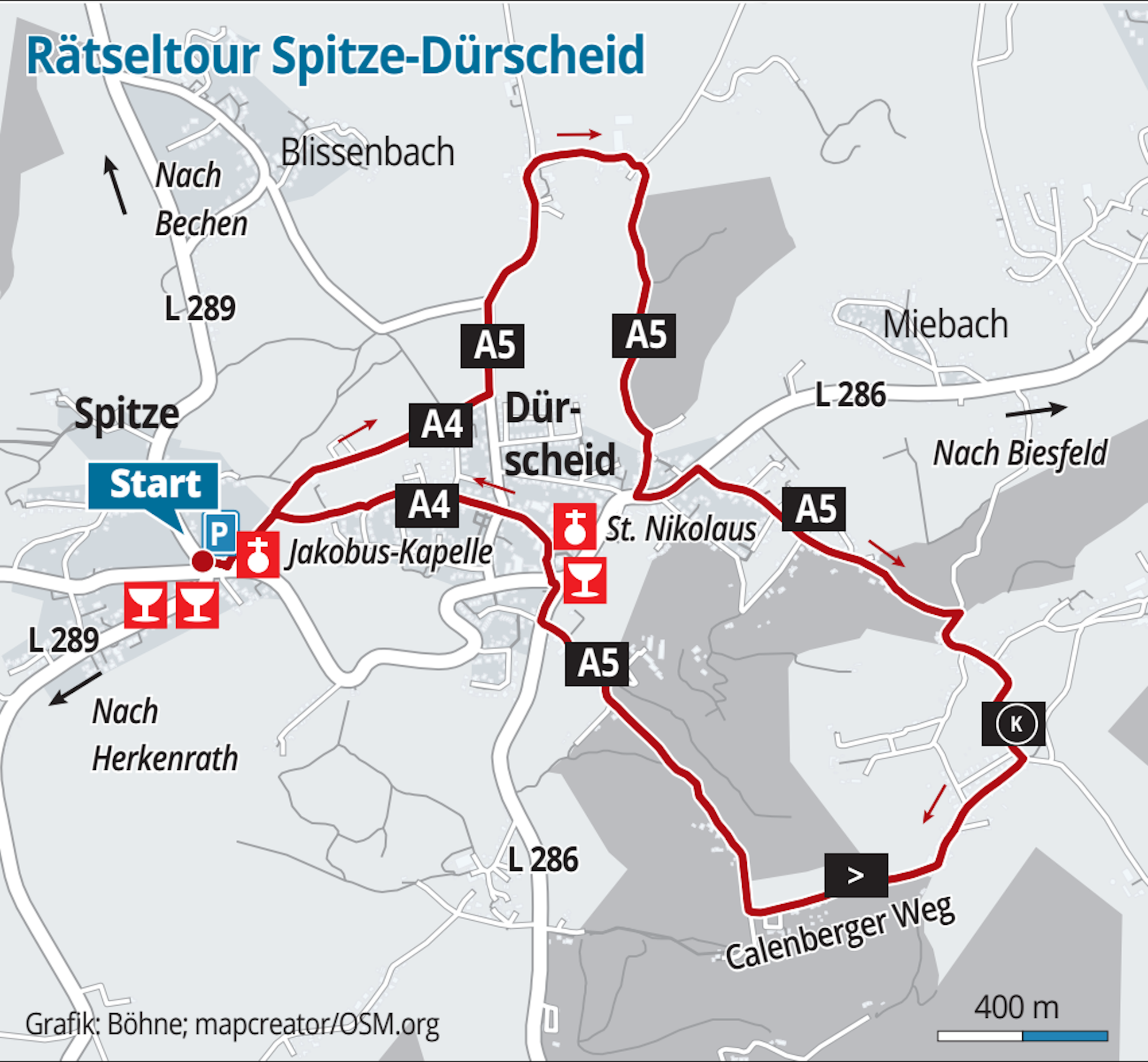 Start/Ziel: Parkplatz Dorfplatz Spitze, Wippefürther Straße 28, 51515 Kürten-Spitze. Anfahrt: Pkw: Aus Gladbachs Stadtmitte Kürtener Straße über Herrenstrunden nach Kürten-Spitze, hinter Ampelkreuzung links auf Parkplatz. ÖPNV: Vom Gladbacher S-Bahnhof mit Bus 426 bis Haltestelle Spitze, direkt gegenüber der Jakobus-Kapelle.Länge/Dauer: 6,6 km, ca. 2 Std.