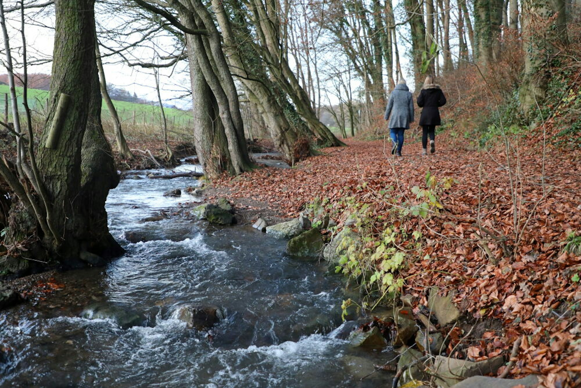 Wir folgen dem Weg am Bach entlang, bis er auf eine Straße (Steegerhöhe) trifft, der wir nach rechts in den Ort Dürscheid zur Wipperfürther Straße (L 286) folgen. An der geht’s nach links bis zu einem Gebäude mit Apotheke.