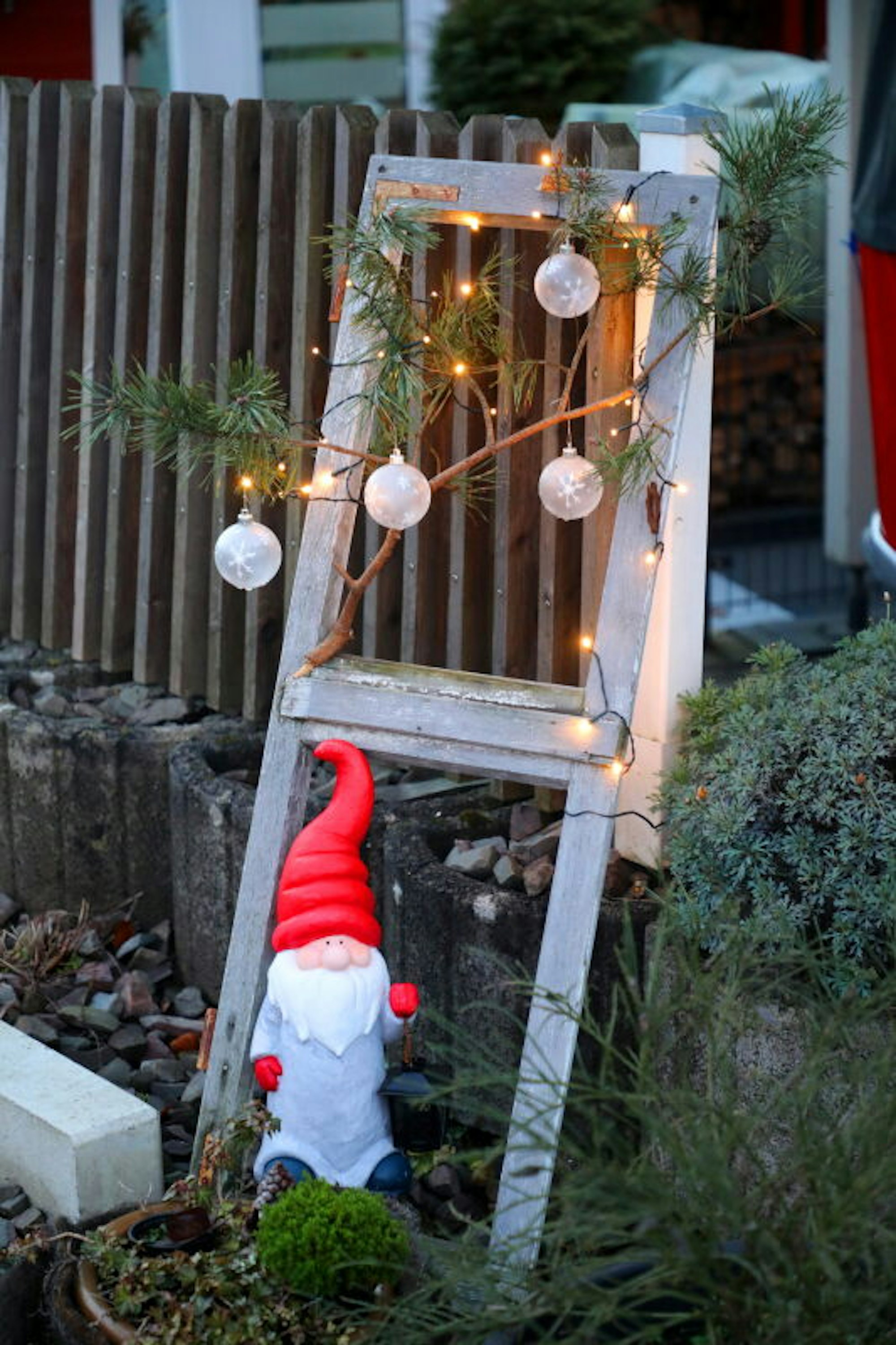 Ein Weihnachtswichtel am Winterberg und die Kirche St. Nikolaus in Dürscheid liegen am Wegesrand.