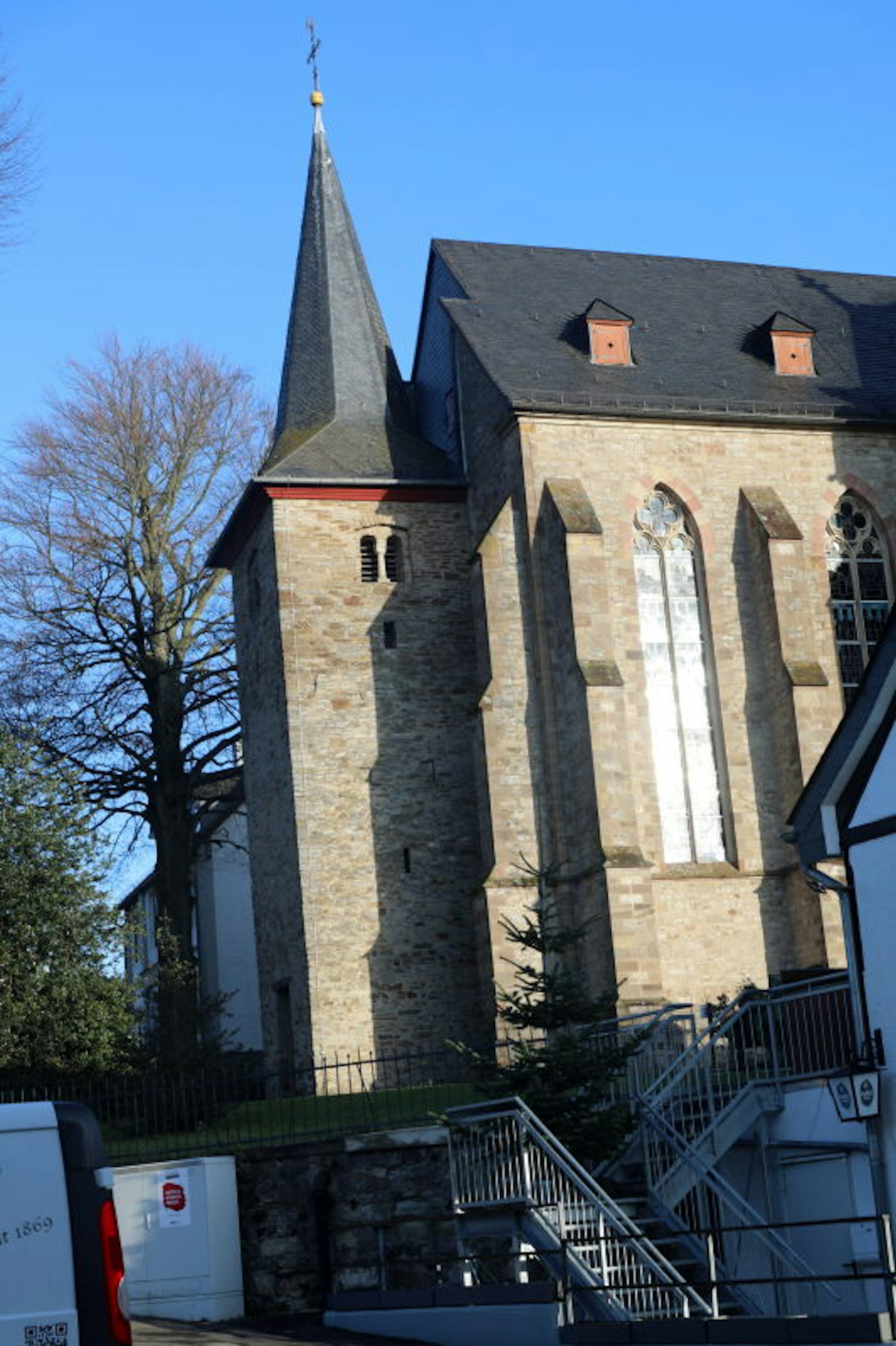 Wir folgen dem Calenberger Weg weiter, durch eine rechtwinklige Rechtskurve und dann bald hinunter ins Dürschtal. An der Einmündung auf die zweispurige Straße gehen wir rechts in den Ort, überqueren die Wipperfürther Straße an der Ampelkreuzung und steigen links neben dem Dürscheider Hof die Treppen zur Kirche St. Nikolaus hinauf.