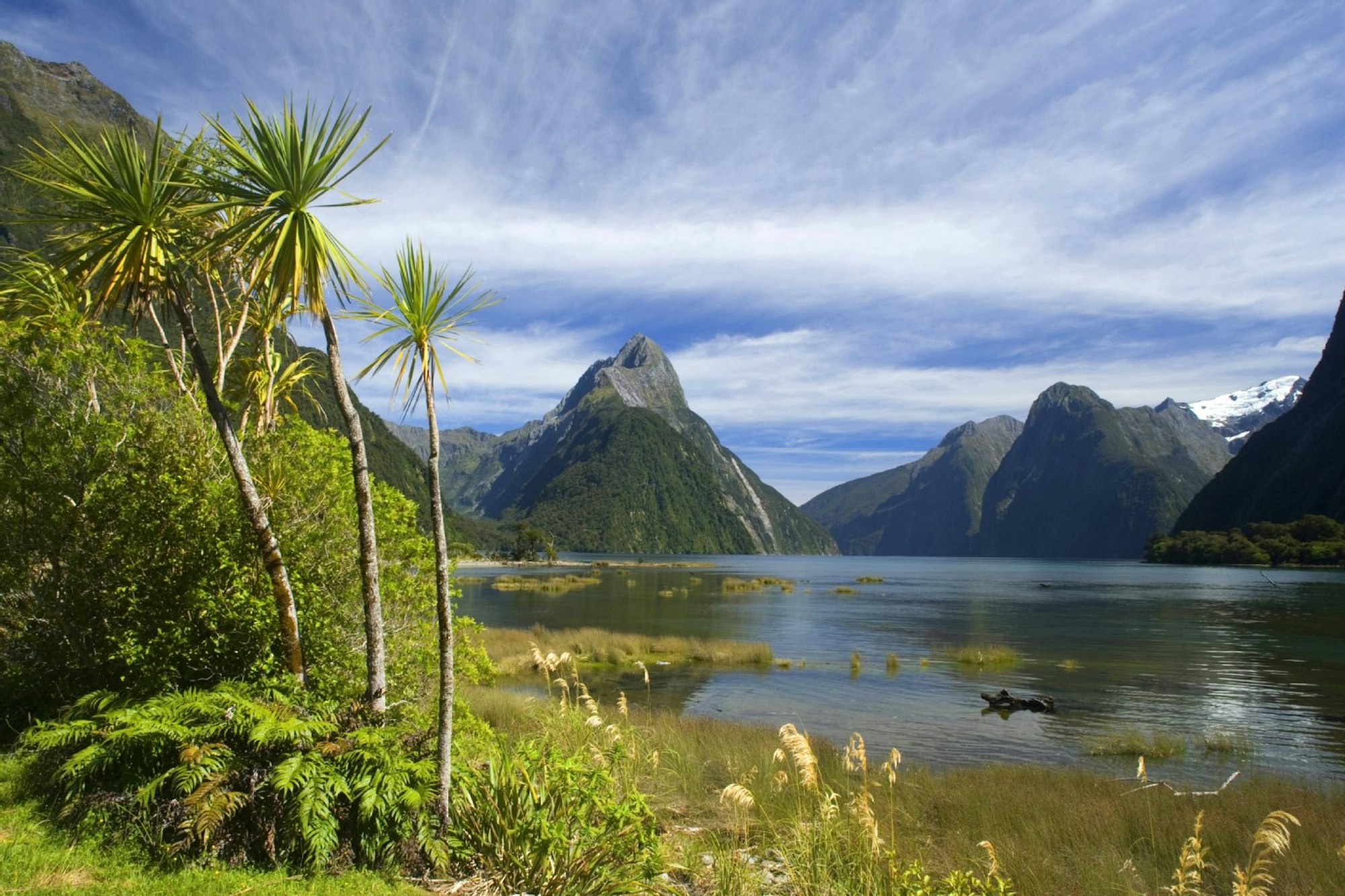 Traumhafte Natur auf Neuseeland Südinsel: Fjord Milford Sound mit Gipfel und umgebenden Bergen.