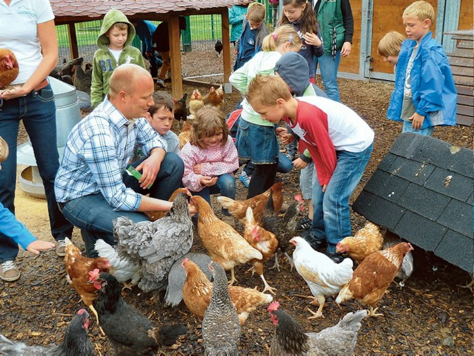 Bauernhof-Chef Peter Zens zeigt Kindern, wie man Hühner füttert.