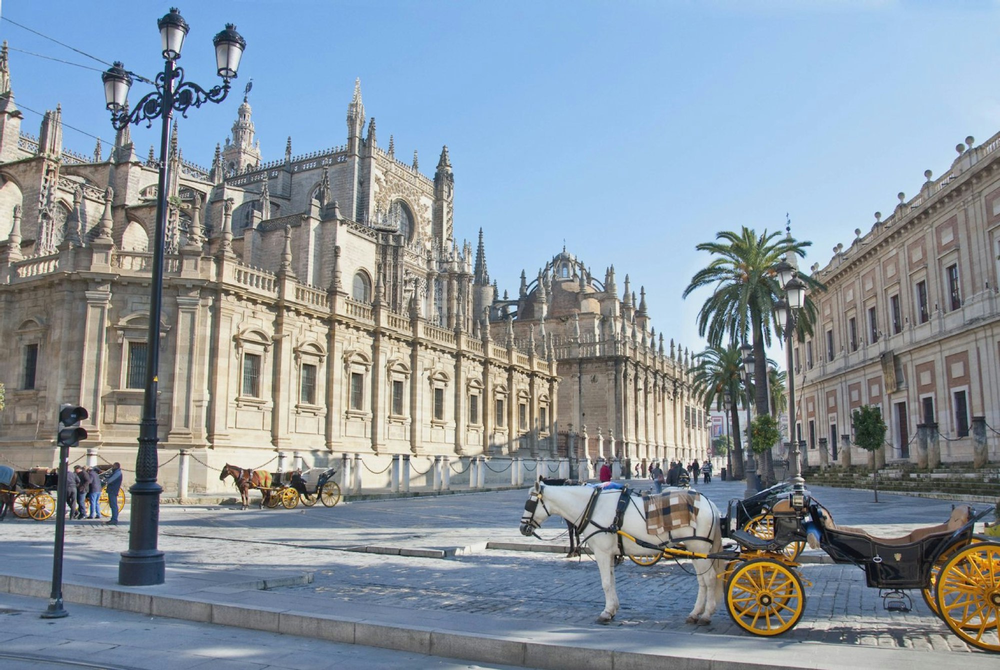 Pferdekutschen warten an der Kathedrale von Sevilla auf Gäste.