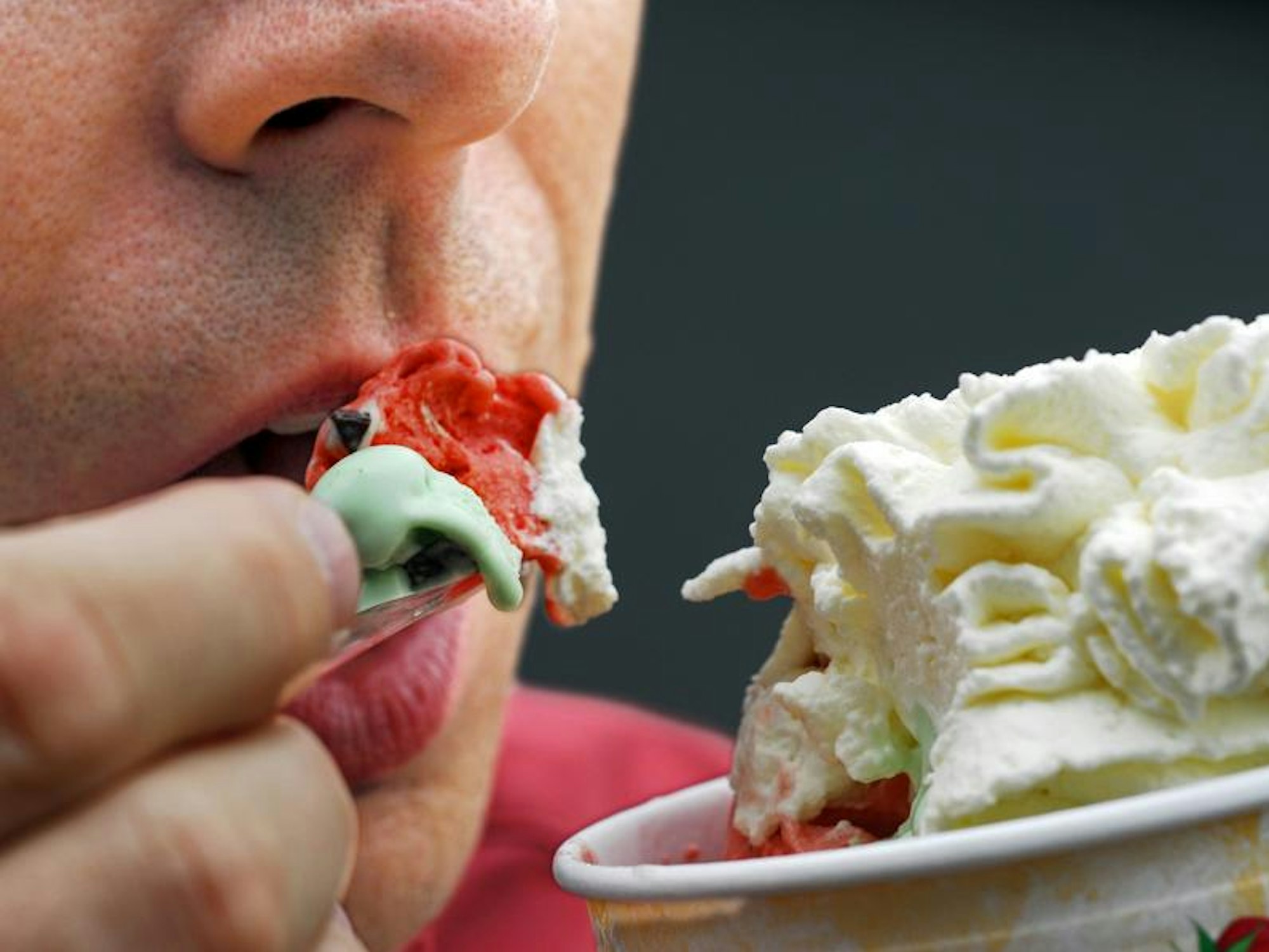 Eis ist an heißen Tagen eine angenehme Erfrischung – aber meistens auch eine Kalorienbombe. „Speiseeis zählt zu den Süßigkeiten, und die sollte man immer nur in kleinen Mengen zu sich nehmen“, sagte Antje Gahl von der Deutschen Gesellschaft für Ernährung (DGE). „Sorbets und Fruchteis haben allerdings ein bisschen weniger Kalorien als Milcheis.“ So stecken in einer 75 Gramm schweren Kugel Zitronensorbet nur 90 Kalorien (kcal), in derselben Menge Erdbeermilcheis schon 150 kcal und in Schokoladenmilcheis sogar 170 kcal.