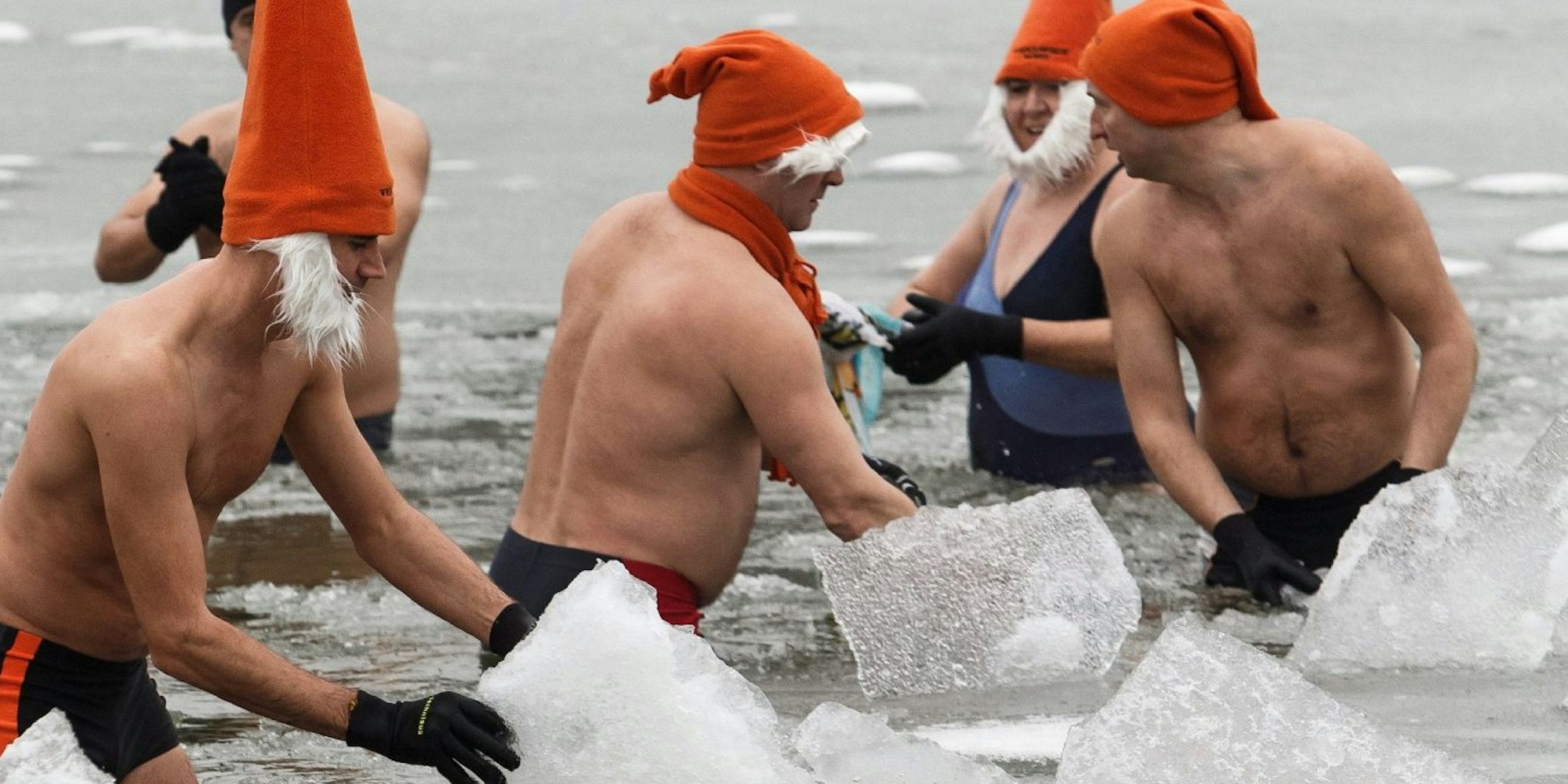 Planschen zwischen Eisschollen: Mitte Februar baden hartgesottene Männer mit Zipfelmützen in einem See bei Breslau (Polen).