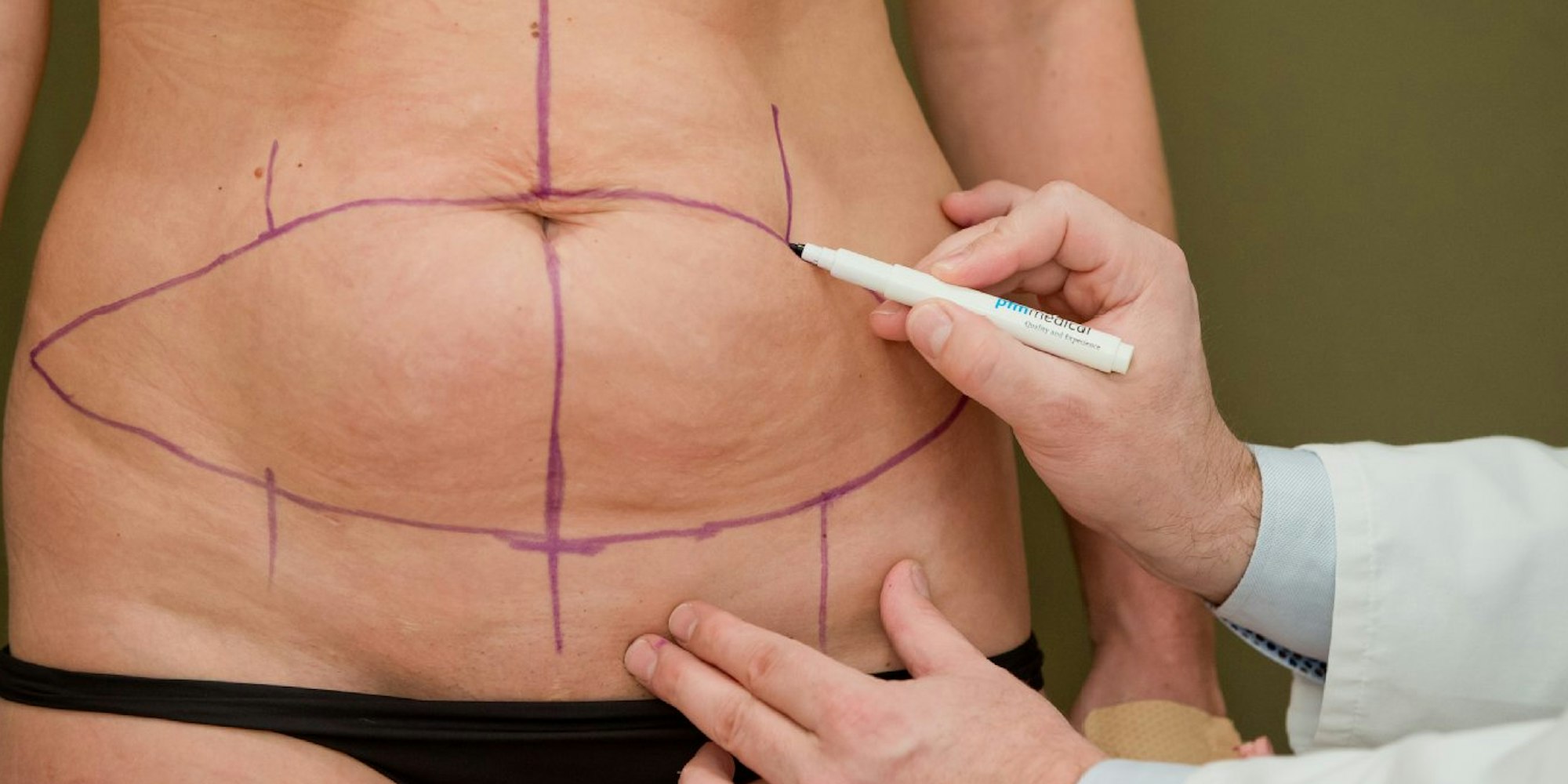 Vor der Operation zeichnet Dr. Jens Baetge, Facharzt für plastisch-ästhetische Chirurgie und Chefarzt an der Nürnberger Klinik für Ästhetisch-Plastische Chirurgie, die Bauchdeckenstraffung vor.