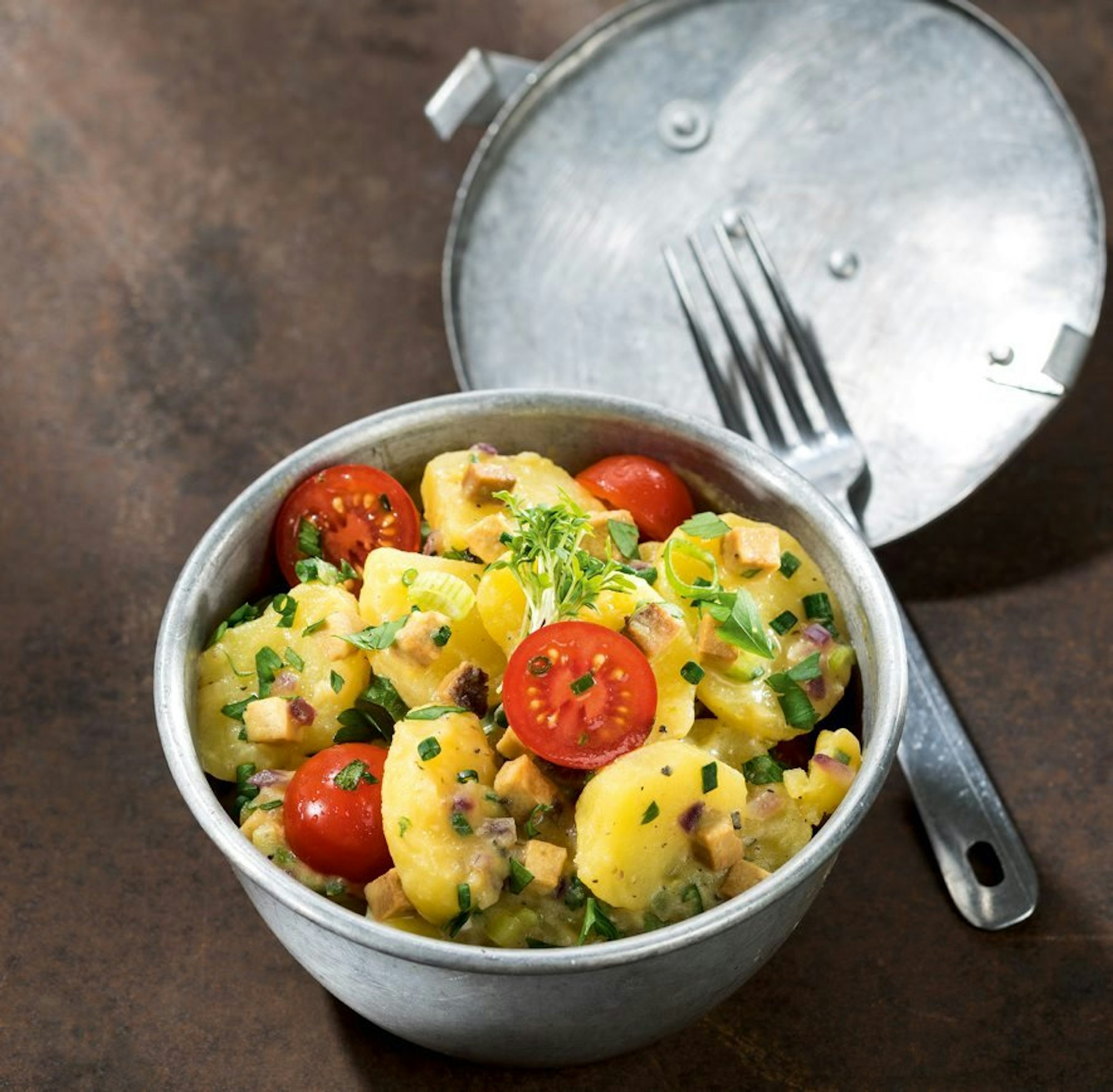 Ein Kartoffelsalat für vegane Feinschmecker bekommt durch Räuchertofu, Kirschtomaten und Senfdressing eine besondere Note.