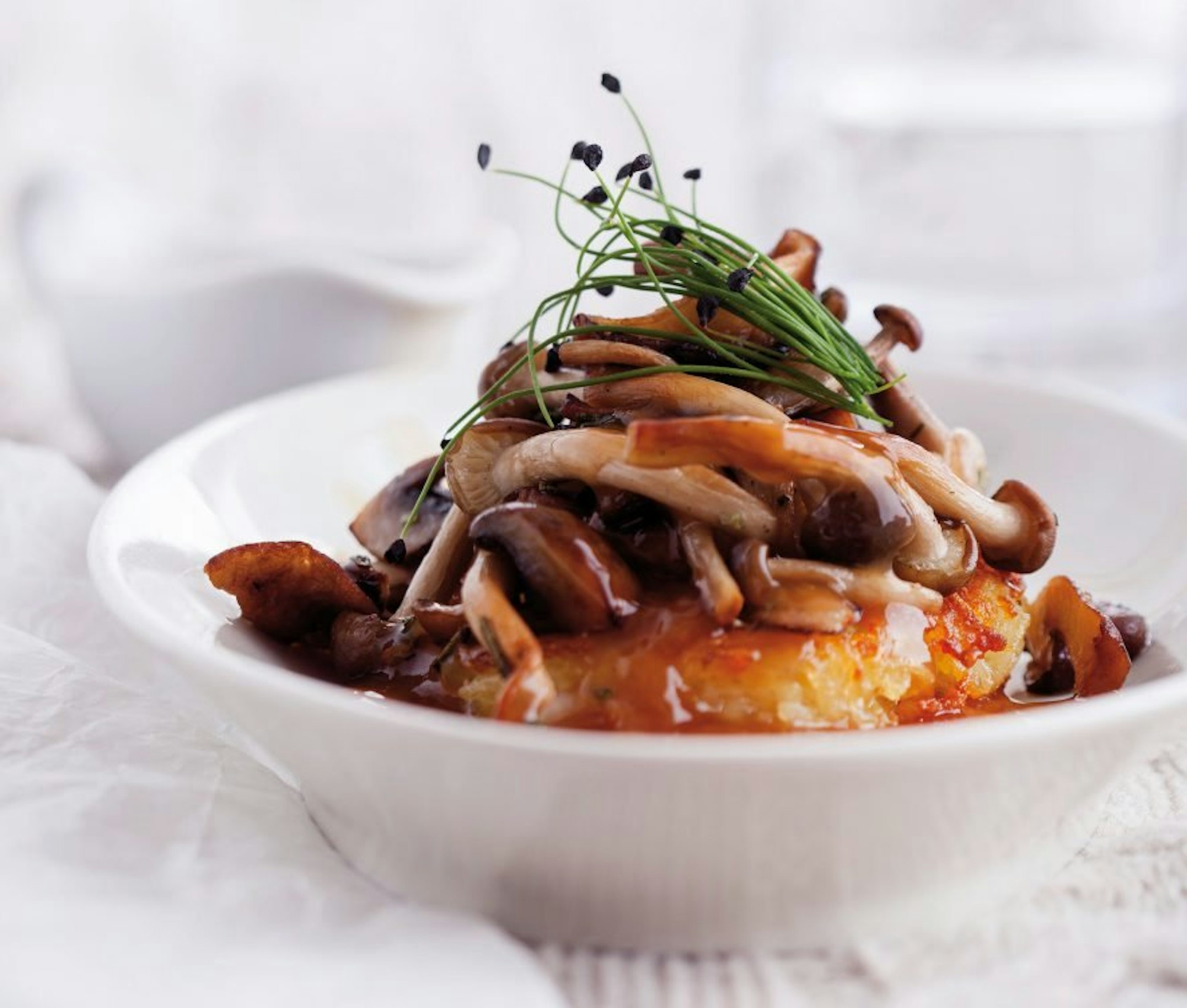 Für Roland Rauter sind Buchenpilze an leichter Knoblauchsoße auf Kartoffelrösti der Zwischengang für das Weihnachtsmenü.