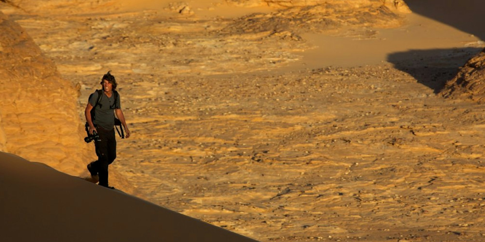 Michael Martin gehört zu den bekanntesten Wüstenfotografen, hier ist er unterwegs im Ennedi-Gebirge der Sahara, Tschad.