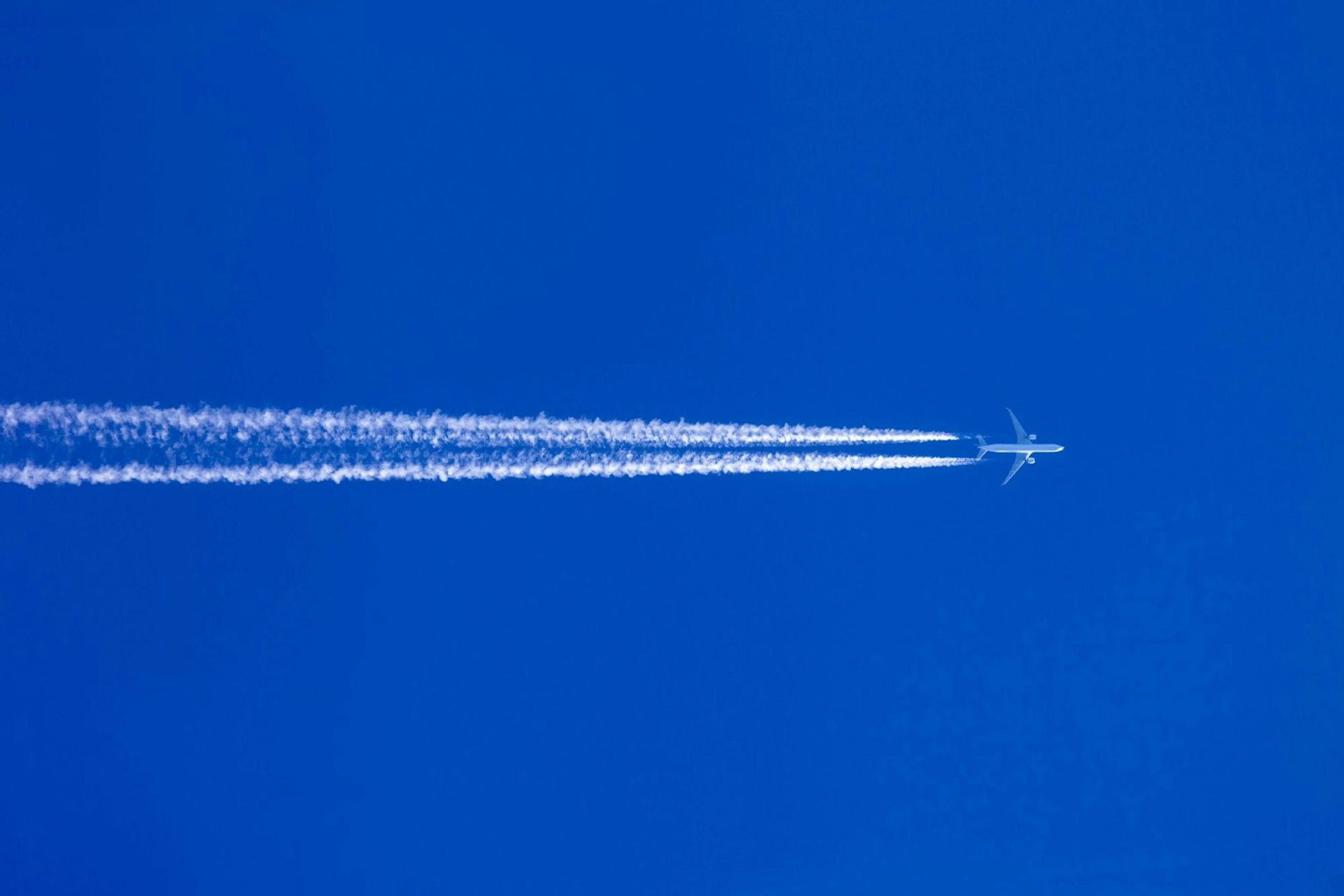 Urlaubsreise und Luftverschmutzung: Ein Flugzeug mit Kondensstreifen.