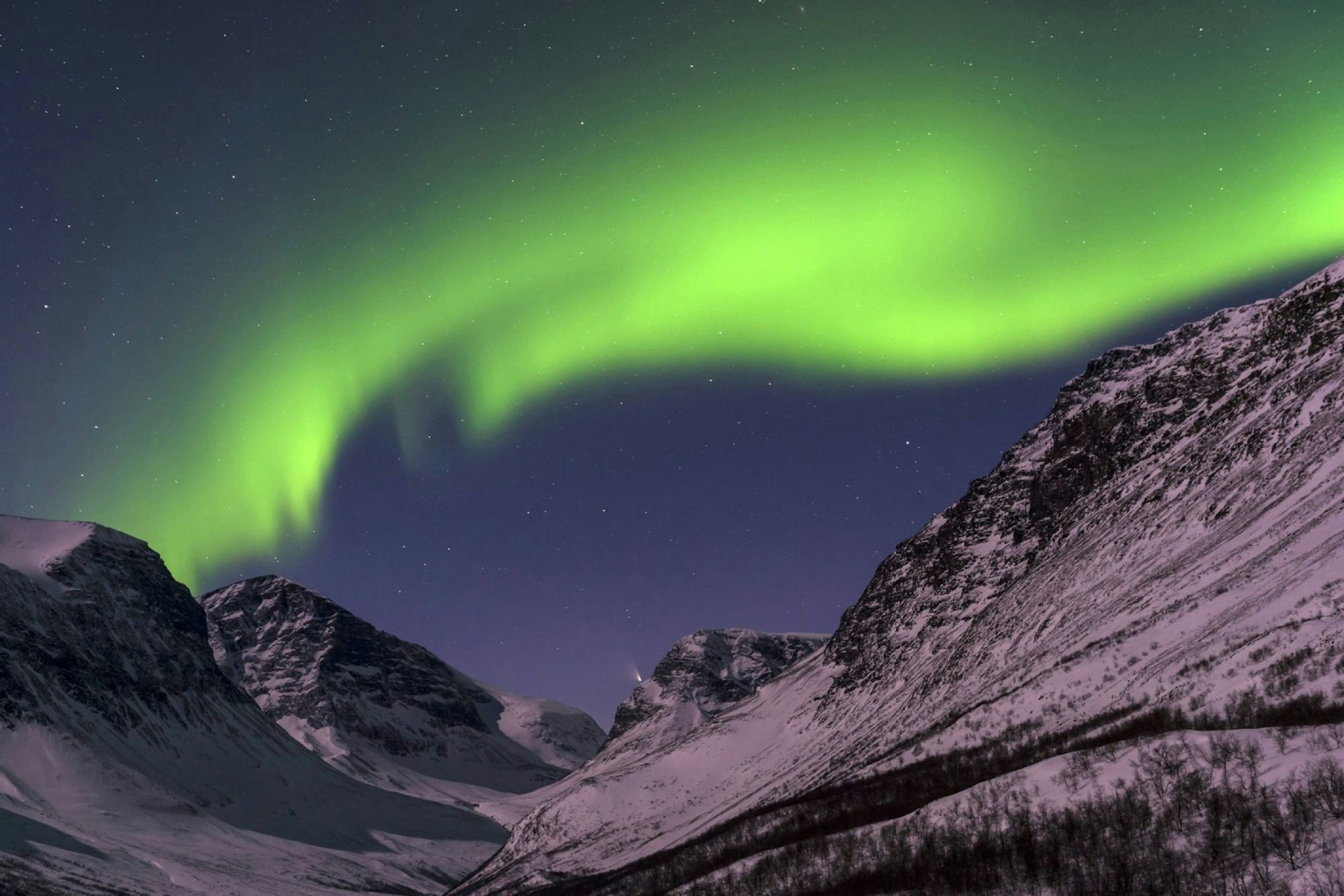 Nordlichter über monderhellten Bergen im Tal Vistasdalen, Lappland, Schweden.