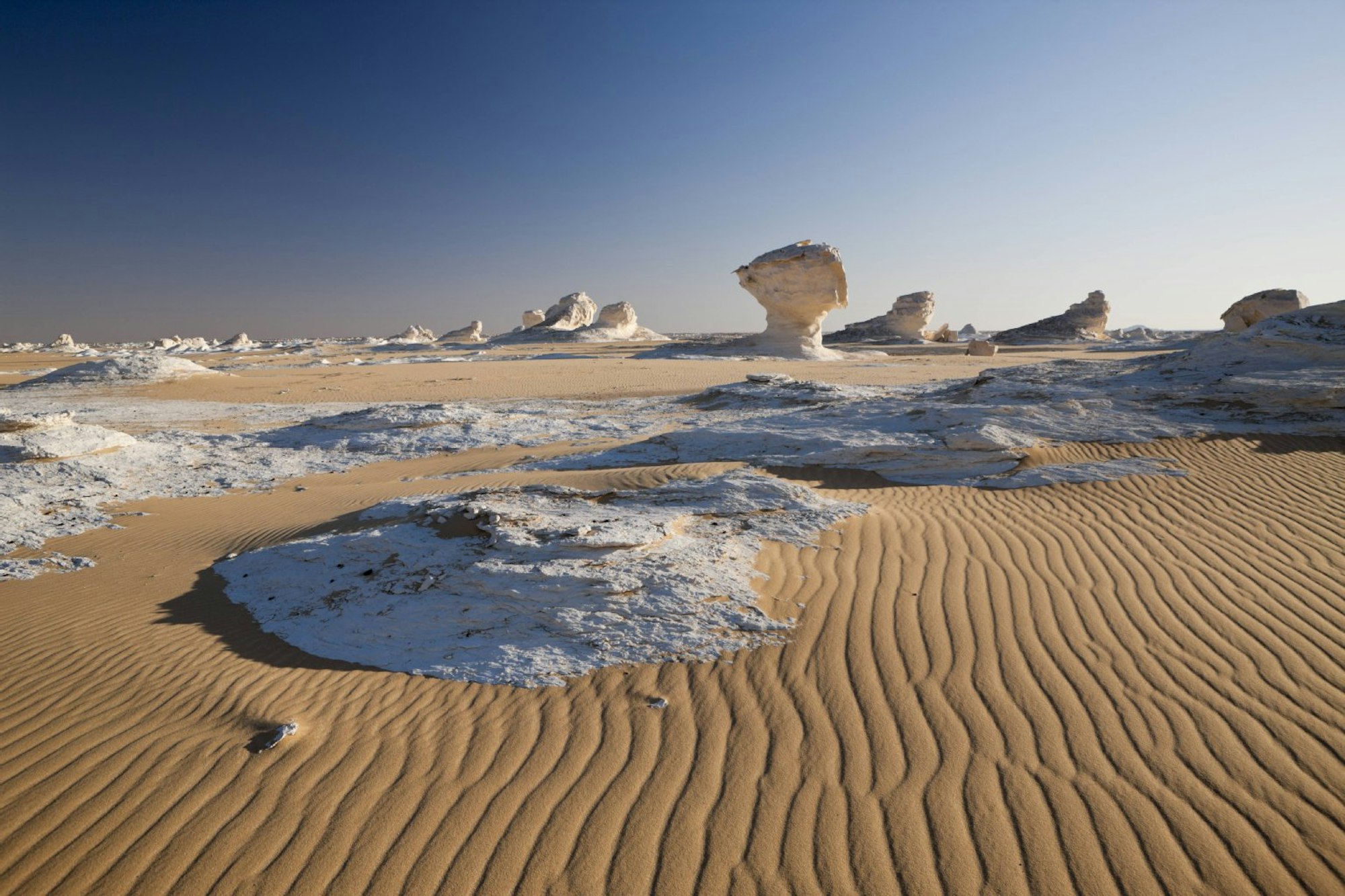 Wie ein großer Skulpturenpark wirkt die Weiße Wüste, etwa 500 Kilometer südwestlich von Kairo, auf manche Besucher. Außergewöhnlich geformte Kalksteingebilde prägen die Landschaft. Sie sind durch Plankton im Mittelmeer entstanden, das in der Kreidezeit das Gebiet bedeckte, in dem sich die Weiße Wüste heute befindet. Ihre Form erhielten die Kalksteinformationen später durch Wind- und Wettererosion.