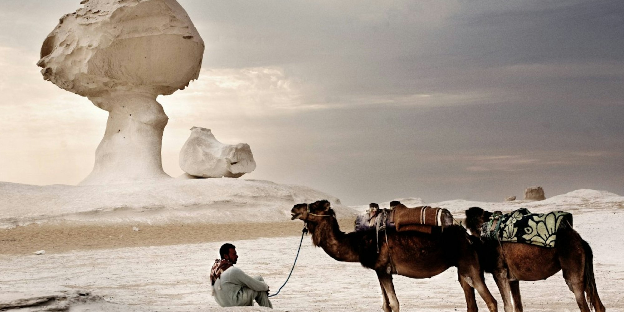 Ein Kamelführer wartet in der Weißen Wüste auf Touristen.