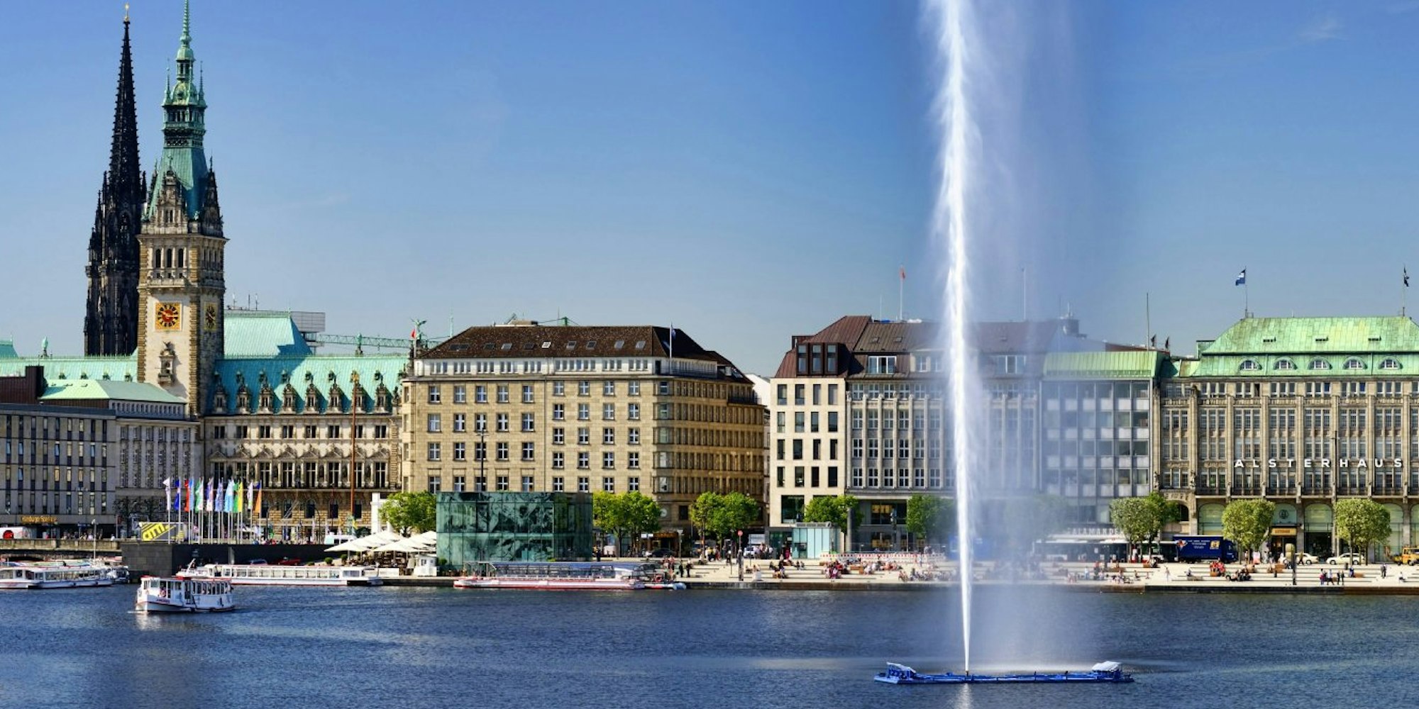 Hamburg: Blick von der Lombardsbrücke über Binnenalster mit Alsterfontäne auf den Jungfernstieg.