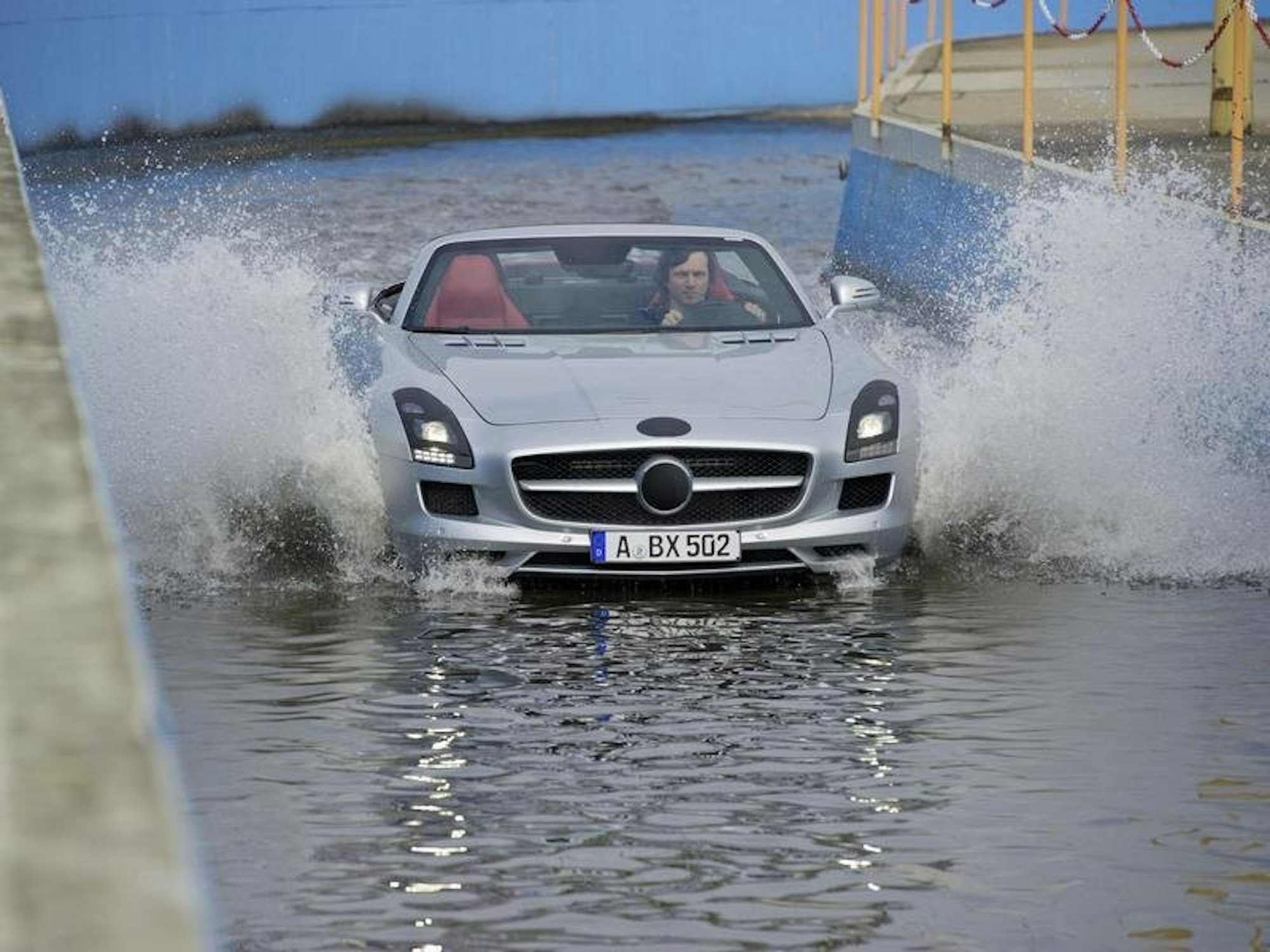 Daher am besten schon frühzeitig die Scheibenwischer auf höchste Stufe stellen und einen Zielpunkt hinter der Wasserlache fixieren. So verliert man nicht die Orientierung und behält die Richtung bei.