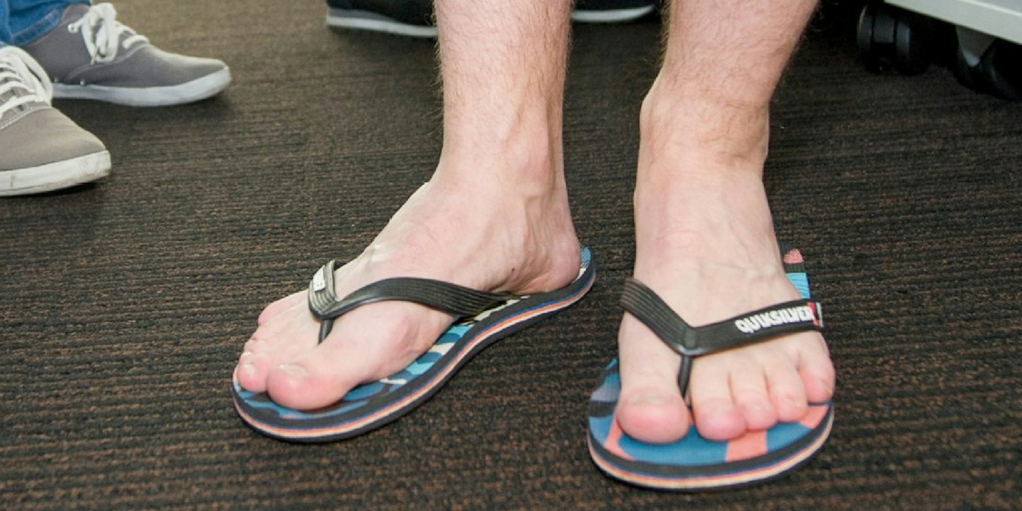 Gleich drei modische Fehltritte in einem Outfit: eine kurze Hose, die die behaarten Männerbeine offenbart, und dazu noch Flip-Flops. Modeexperten raten von diesem Look fürs Büro ab.
