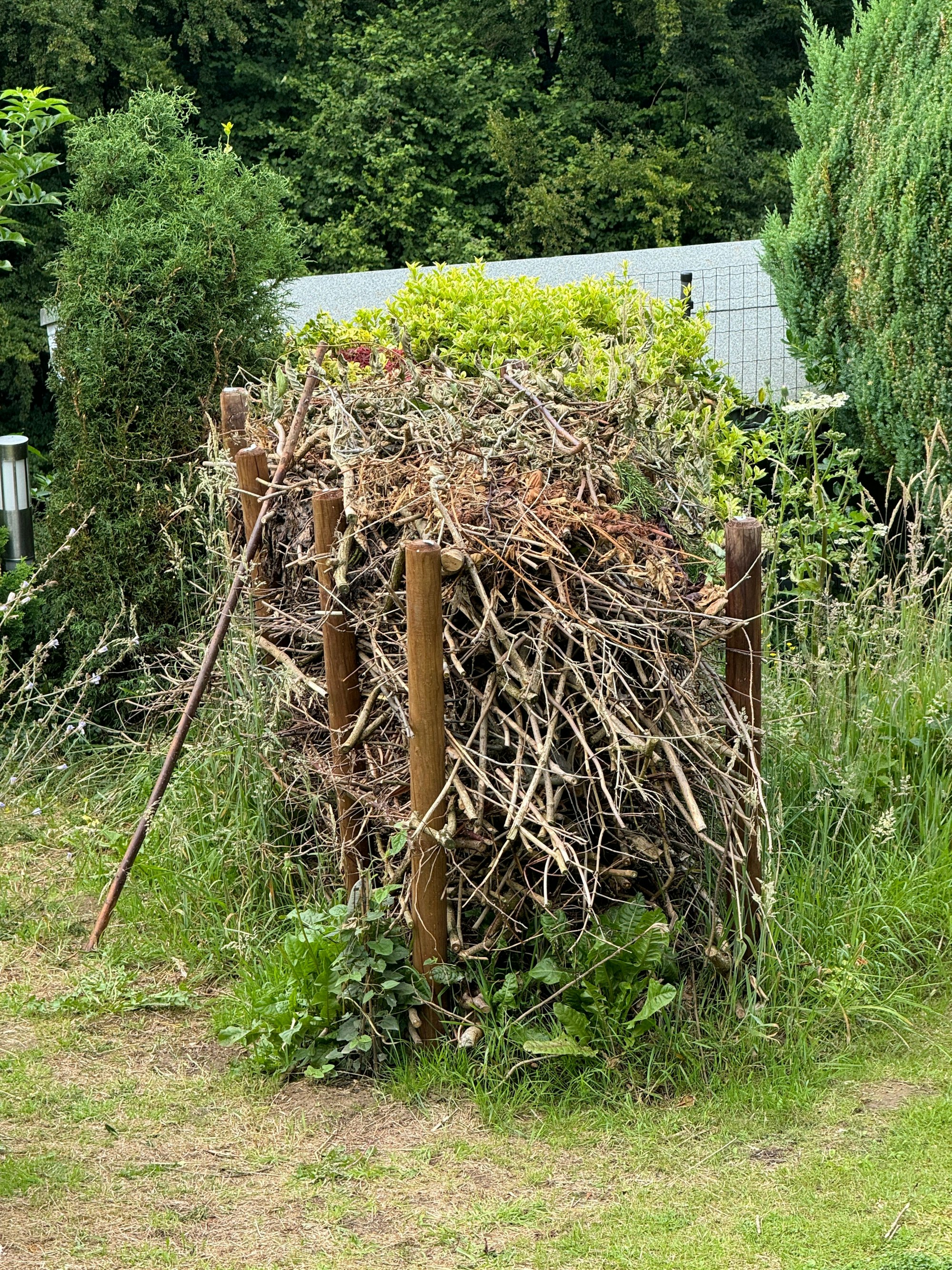 Grünschnitt also besser in einzelnen Schichten mit in den Kompost oder als Füllmaterial ins Hochbeet oder kleingehäckselt zum Mulchen verwenden. Auch Wildtiere profitieren von etwas Unordnung. Brämer selbst setzt beispielsweise auf Totholzhecken. Zwischen Begrenzungspfosten am Gartenrand stapelt er dann Äste und Grünschnitt. „Es dauert wenige Tage, dann ziehen da schon die Spatzen ein.“
