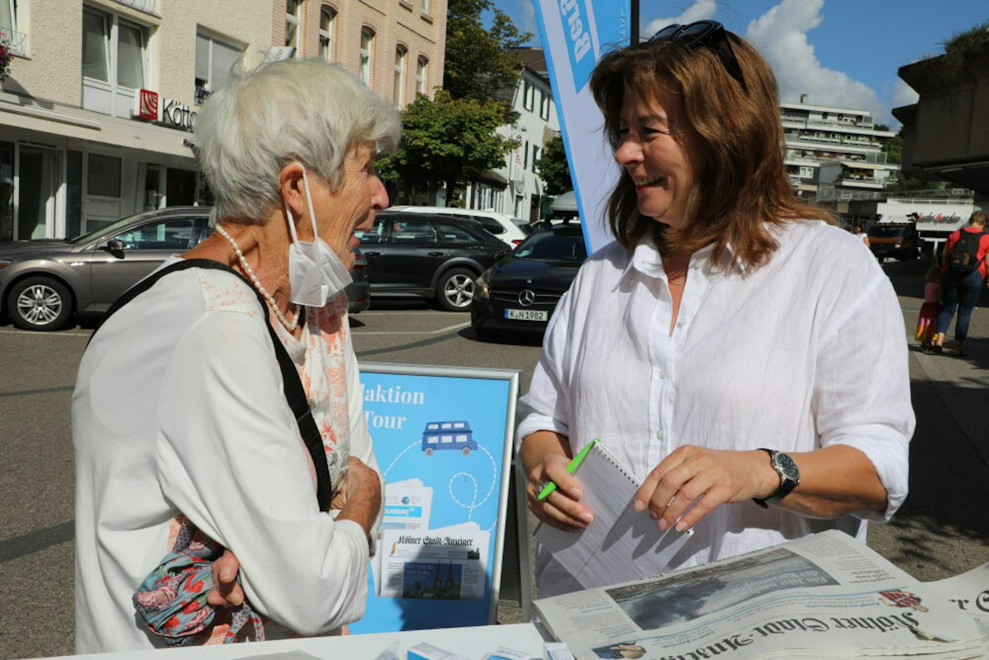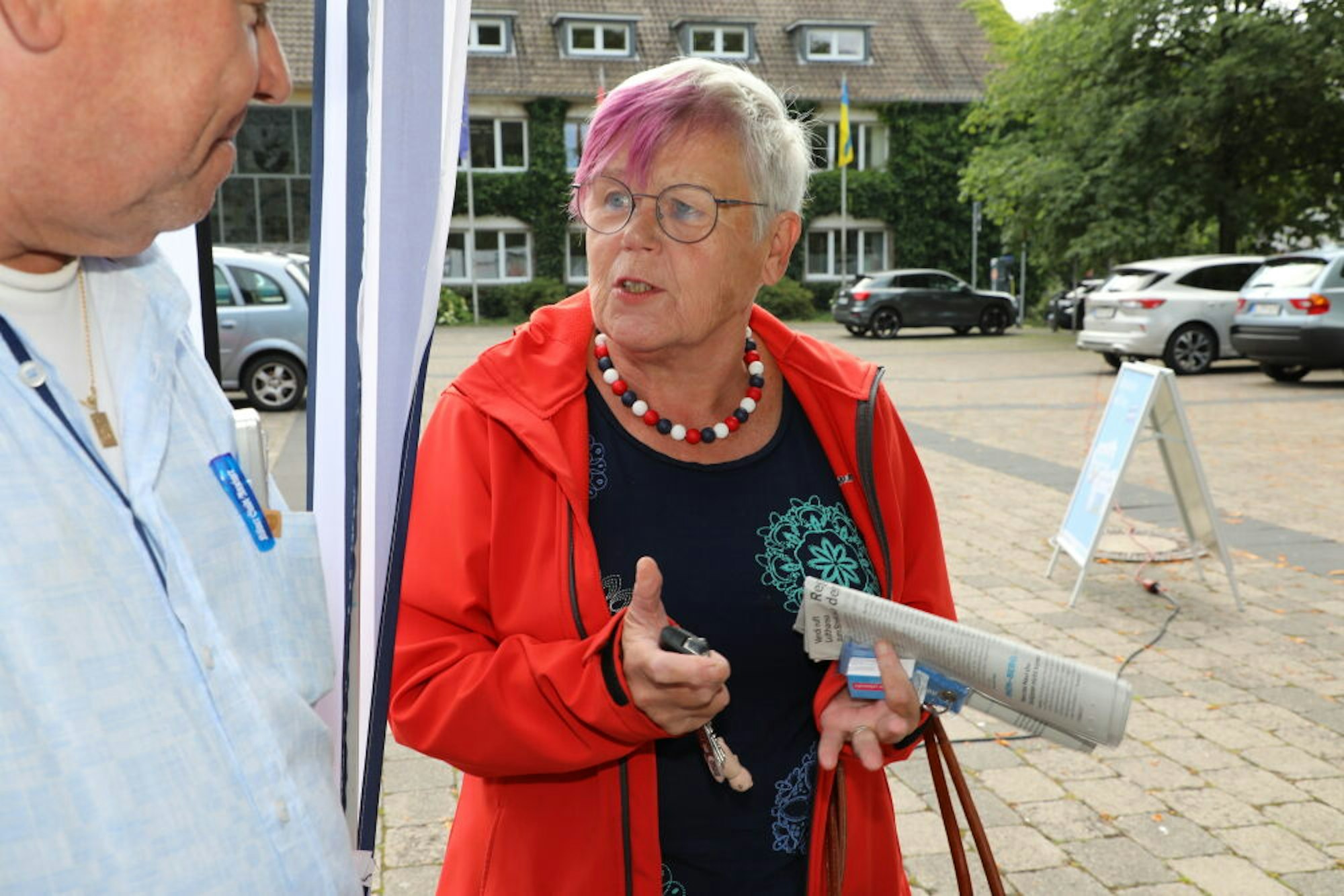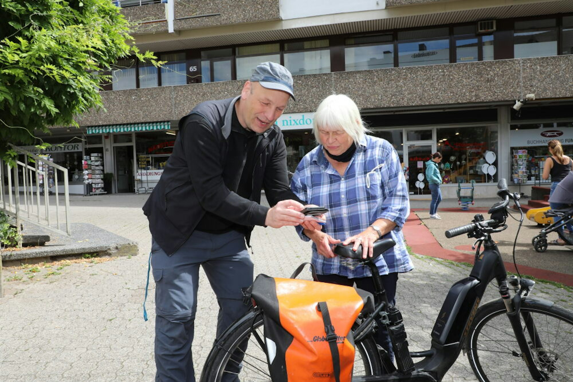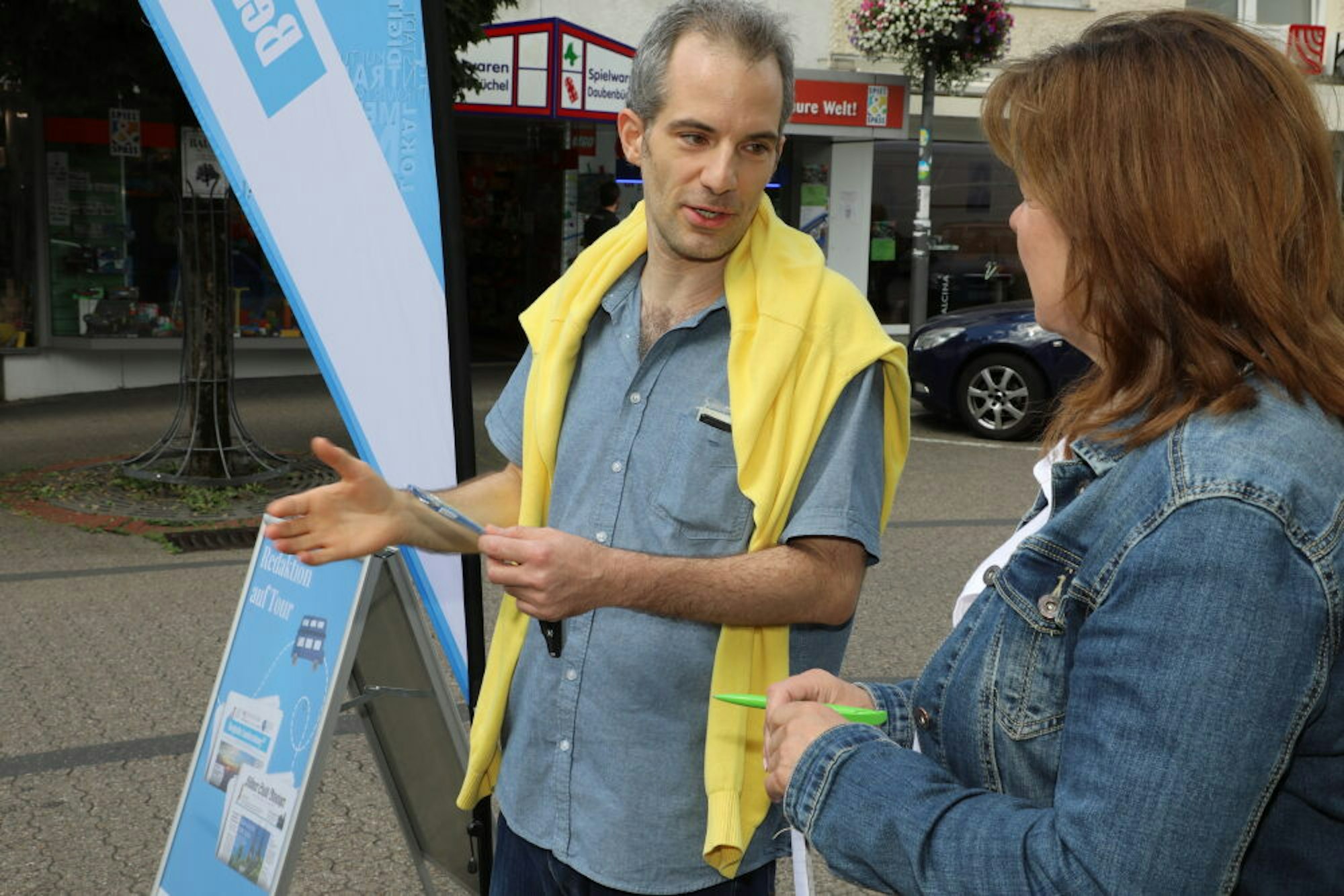 Ein Radfahrer legt einen kurzen Stopp am Stand ein: Er fragt nach der anvisierten Öffnung der Jägerstraße in Forsbach für den Radverkehr in zwei Richtungen. Nachdem die Stadtverwaltung die Situation in der Straße geprüft und eine Öffnung wie auch in weiteren Straßen empfohlen hat, wünscht er sich Taten. Ein anderer Radfahrer, Karl Günter Peters, kommt hinzu und warnt vor der Hoffnung auf rasche Umsetzung: „Ich würde mich mal einrichten auf ein paar Jahre bis dahin.“