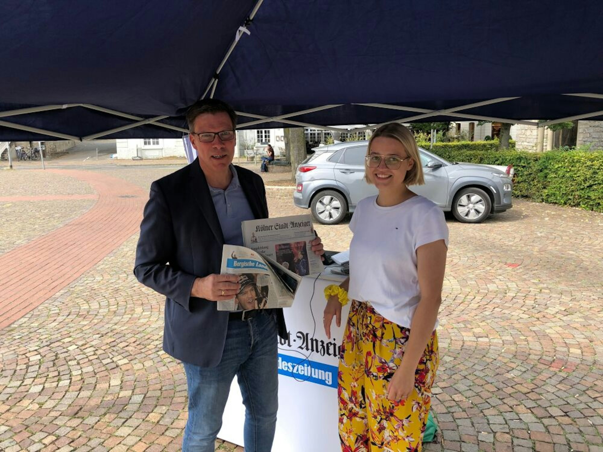 Landrat Stephan Santelmann erzählt am Redaktionsmobil, dass er bereits seit einigen Jahrzehnten die Zeitung abonniert hat. „Wenn sie beim Frühstück nicht da ist, fehlt etwas“, sagt er. Auch wenn er zwischendurch Nachrichten online lese, könne er auf das Printprodukt morgens nicht verzichten. „Und was möchten die Menschen so wissen?“, fragt er Volontärin Alina Bremer an der mobilen Redaktion.