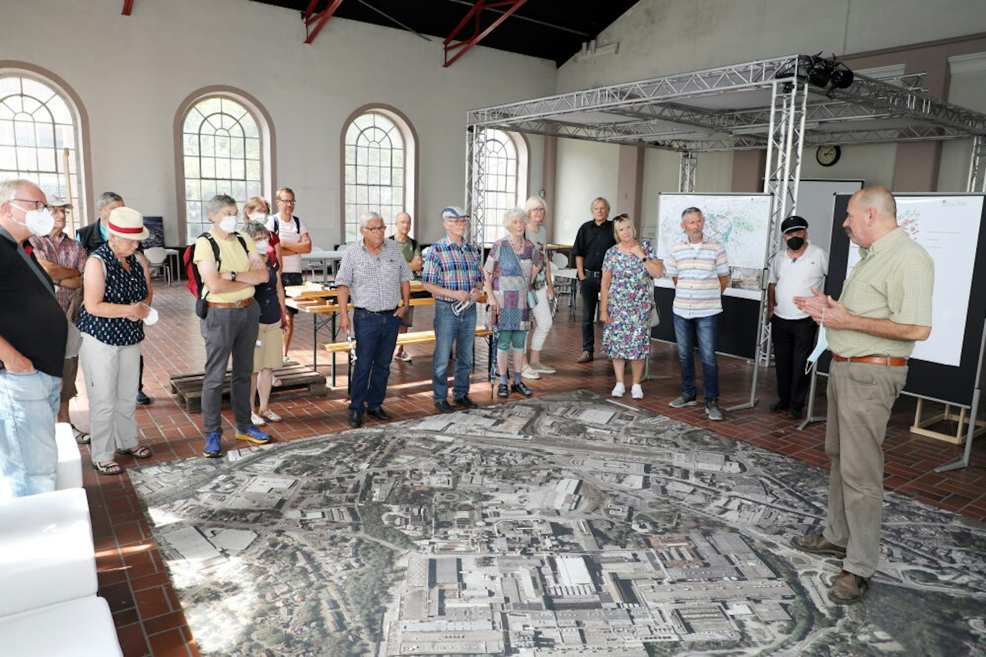 Knapp 4000 Mitarbeiter habe das Werk einst gehabt. Als er vor acht Jahren gegangen sei, seien es noch knapp 400 gewesen, sagt Gottschling. Er erzählt davon, wie es vor einigen Jahren in einem Papierrollenlager brannte, und führt die Gruppe unter den Fenstern seines ehemaligen Büros entlang zu einem der denkmalgeschützten Gebäude, in dem nun Pläne, Ideen und Zwischenstände der aktuellen Debatte um die Umgestaltung des Industriegeländes zu einem neuen Stadtteil zu sehen sind.