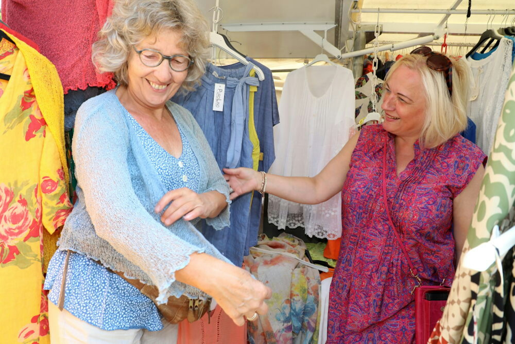 „Ich mag es auch, hier Leute zu treffen, sich ein bisschen zu unterhalten“, sagt die gelernte Hebamme und lässt sich ein bisschen treiben, bevor sie spontan eine Bolero-Jacke an einem Bekleidungsstand ansteuert. Wenig später wandert noch ein Sommerkleid in den Einkaufskorb. Für Salat ist darin immer noch genügend Platz . . .