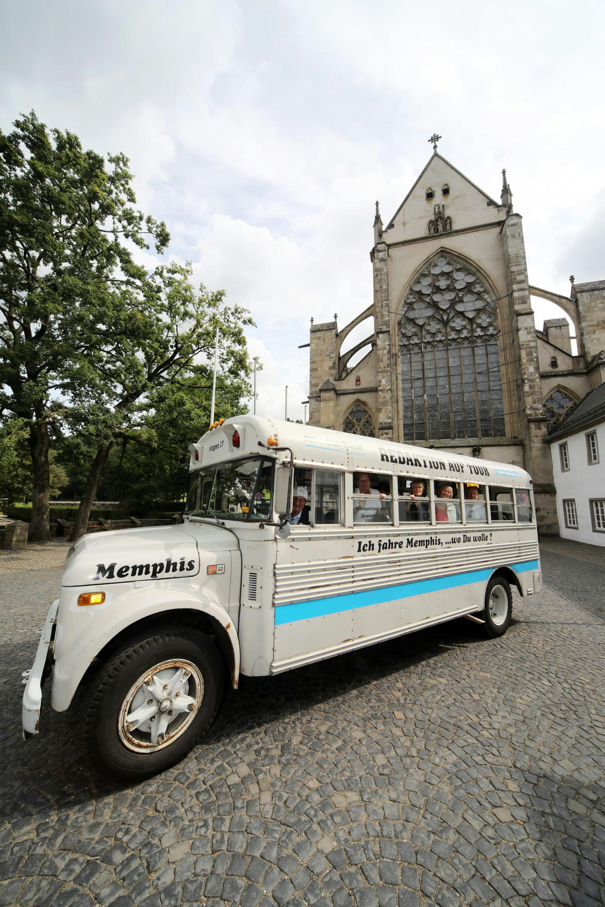 Mit dem historischen amerikanischen Schulbus, den die Humanitäre Hilfe Overath für die Sommertour der Lokalredaktion erneut zur Verfügung gestellt hat, ging es zunächst tief durch die Overather Geschichte hinauf nach Marialinden, wo bekanntlich ebenfalls ein „Dom“ steht.