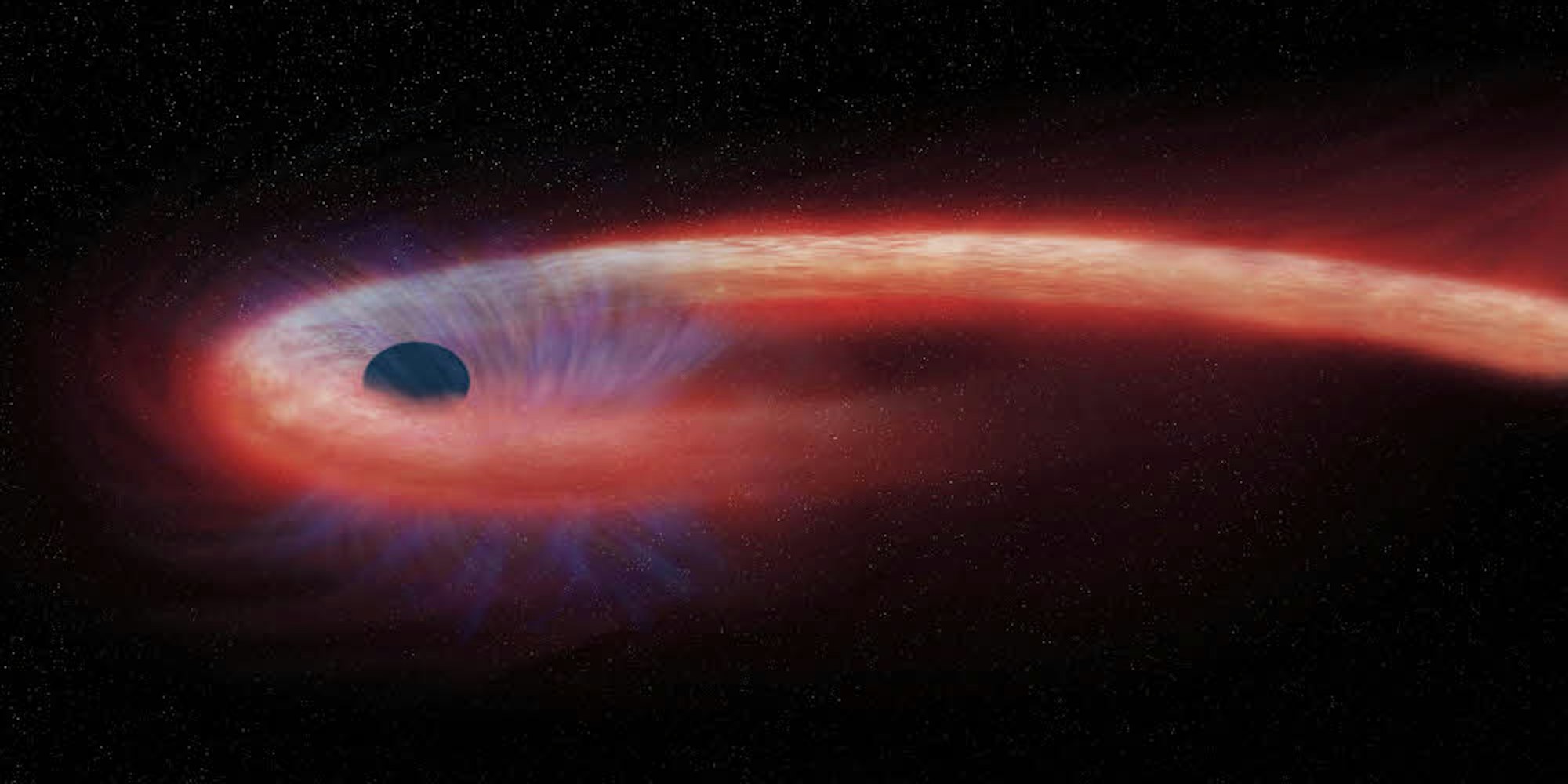 Diese von der Nasa bereitgestellte künstlerische Darstellung zeigt einen Stern, der von einem Schwarzen Loch geschluckt wird und dabei einen Schweif aus Röntgenstrahlen nach sich zieht, dargestellt in rot.