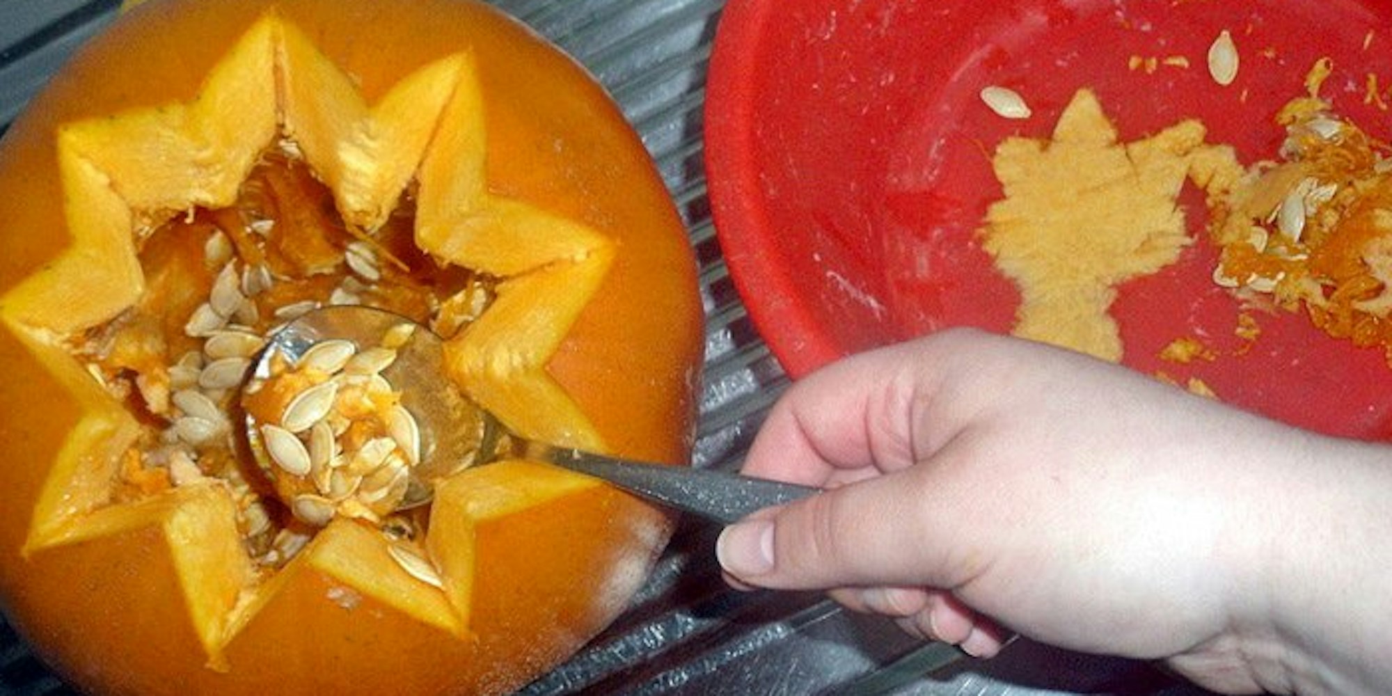 Das gestaltet sich nicht immer so einfach, an manchen Stellen braucht man etwas Kraft, um Kürbissfleisch und Kerne herauszuhebeln. Übrigens: Wer mag, kann diese Reste weiterverwerten. Aus dem Fruchtfleisch kann man Suppen kochen oder leckere Kuchen backen. Die Kerne schmecken geröstet und gesalzen sehr lecker – und man hat gleich etwas für das Halloween-Buffet.