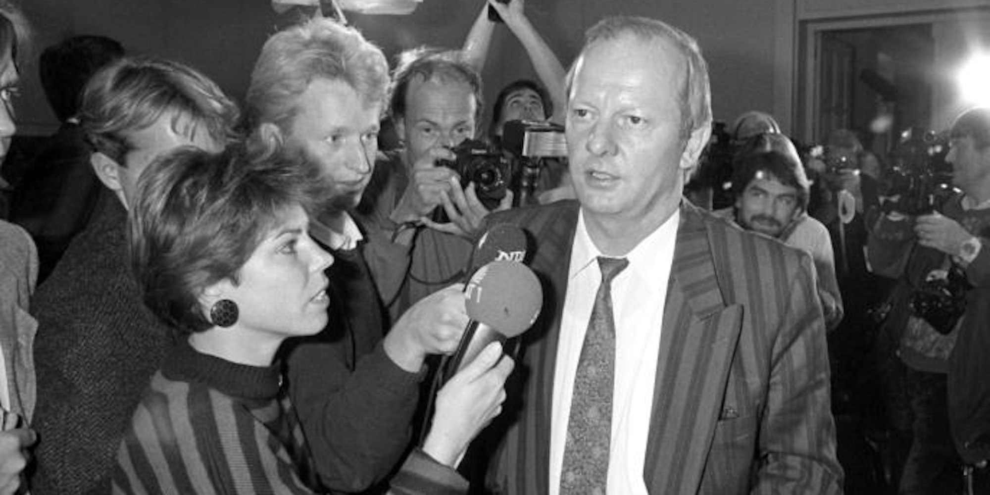 Reiner Pfeiffer wird am 23.10.1987 von Journalisten umringt. Foto: Wulf Pfeiffer/Archiv
