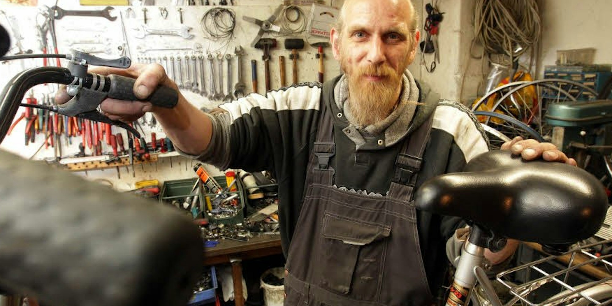 Vor elf Jahren machte der damals arbeitslose Tischler sein Hobby zum Beruf und gründete eine Zweirad-Werkstatt. Seit einem Jahr betreibt er zusätzlich einen An- und Verkauf für Antiquitäten. Baranowski ist von Sammelleidenschaft besessen. Mittlerweile hat er weit mehr als 500 alte und uralte Gebrauchträder im Bestand. Einige hat er geschenkt bekommen, andere ersteigert, etliche aus Nachlässen übernommen. Was der 45-jährige Sülzer in Kellern, Lagerräumen und in seiner Werkstatt an der Marsiliusstraße gehortet hat, würde reichen, um ein Fahrradmuseum auszustatten.