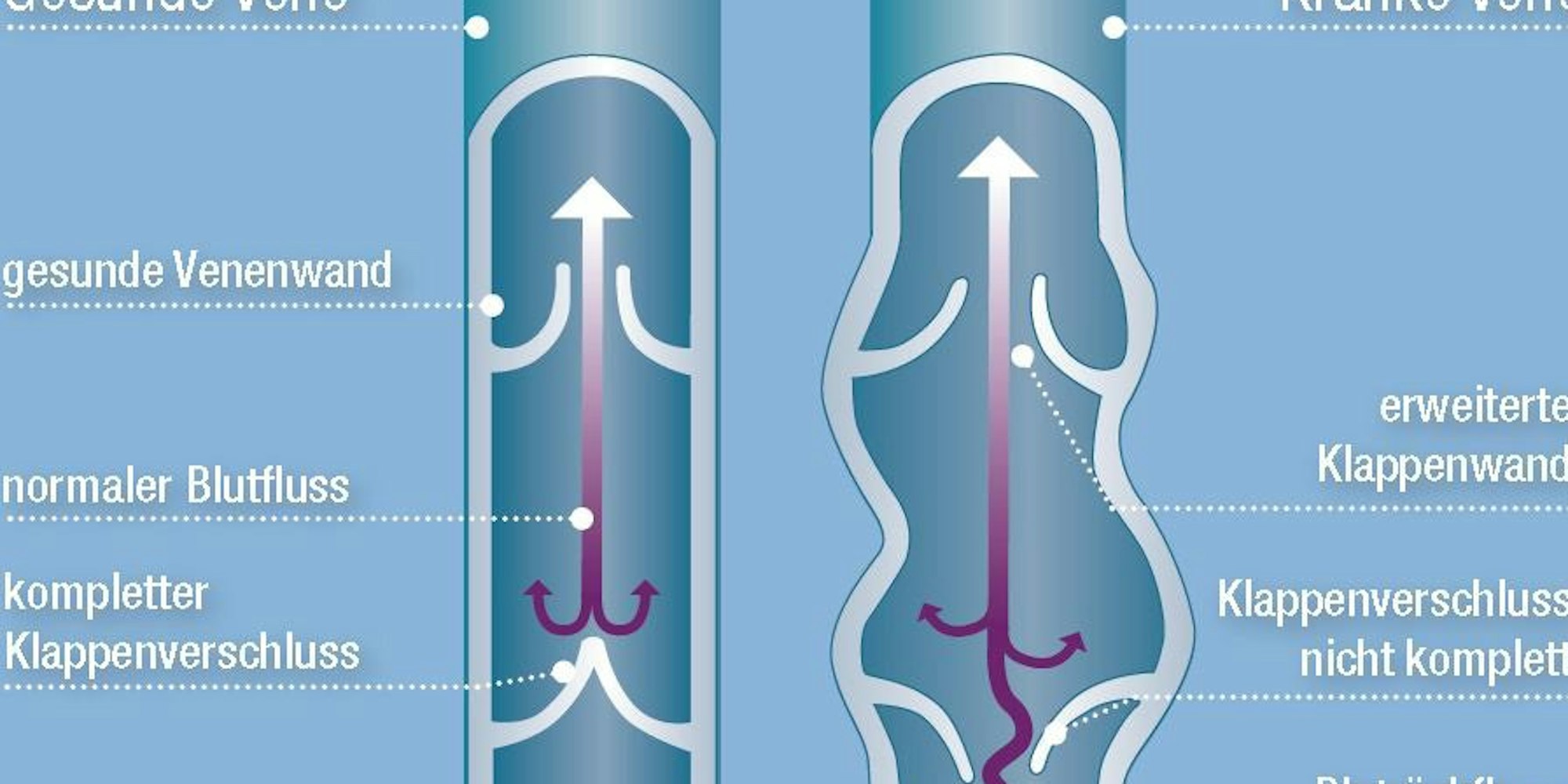Sind die Venenwände überlastet und die Venenklappen schließen nicht mehr richtig, versackt das Blut in den Beinen. Besenreiser und Krampfadern entstehen, die Beine fühlen sich schwer an.Wird nicht behandelt, drohen Venenentzündungen, offene Beine, Thrombosen und lebensbedrohliche Lungenembolien.