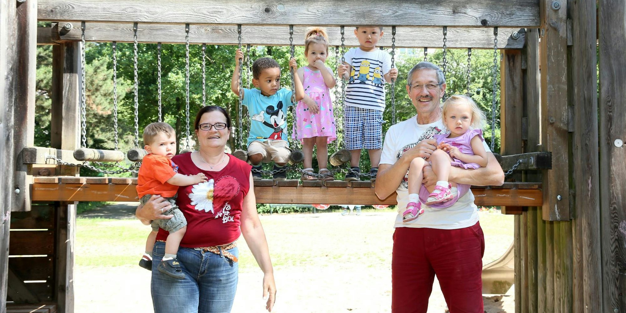 Köln – Die kleine Isabella zieht Uwe Grunert (59) zur Schaukel, die im Schatten liegt. Die Zweijährige zieht sich hoch aufs Schaukelbrett und bedeutet Grunert, für den nötigen Schwung zu sorgen. Für Isabella und die anderen vier Tageskinder von Grunerts Frau Angelika ist der Spielplatz an der Brehmstraße die tägliche Anlaufstation.
