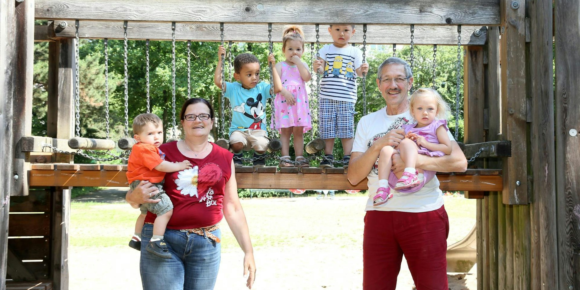Angelika und Uwe Grunert mit ihren Tageskindern – dank des Engagements des Ehepaares wurde der Riehler Spielplatz wieder ein beliebter Treffpunkt für viele Familien aus der Nachbarschaft.