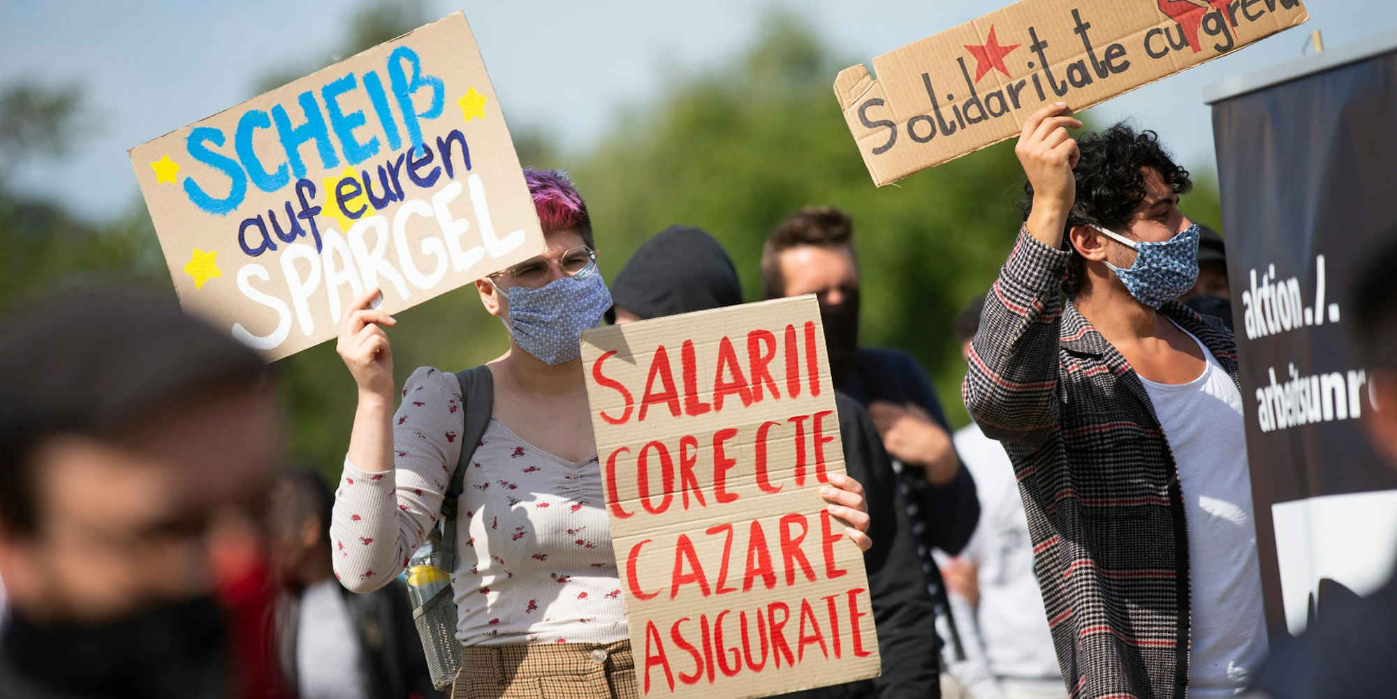Erntehelfer des Spargelbetriebs Ritter demonstrierten am Montag in Bornheim.