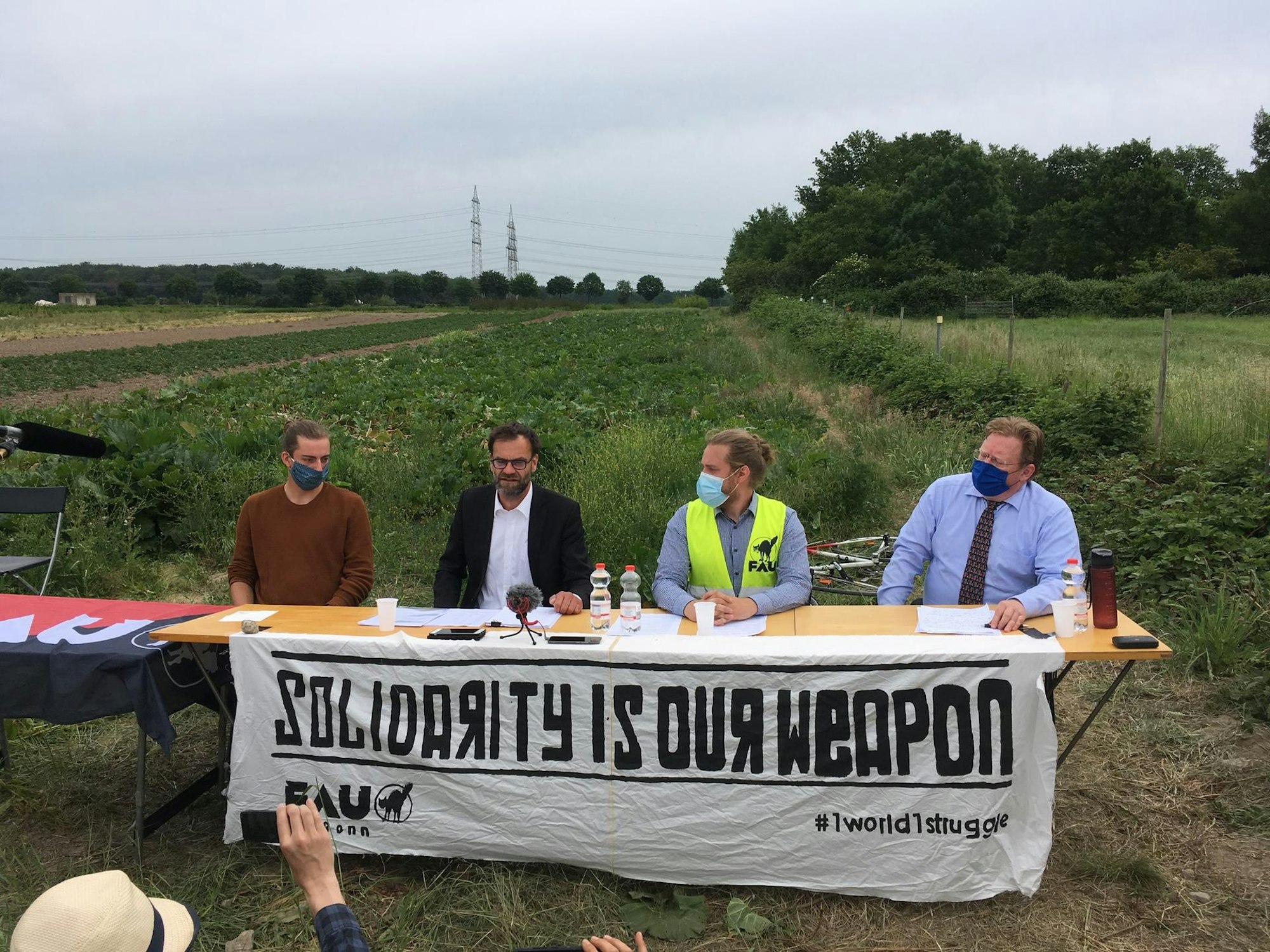 Die Mitarbeiter hätten jeweils am Montag und Mittwoch „ihre Löhne vollständig ausgezahlt bekommen“. Laut Sprecher wurden am Montag Erntehelfer von Demonstrierenden beleidigt. FAU-Sprecher Erik Hagedorn schildert die Vorgänge ganz anders: Die Demonstranten seien von Erntehelfern als Vermittler gerufen worden, weil der Shuttle-Bus zur Kantine nicht losgefahren sei.
