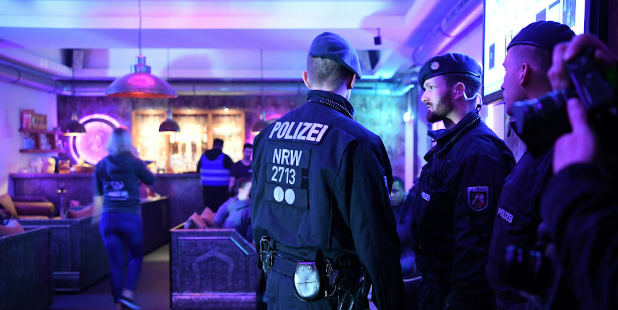 Polizisten stehen bei einer Razzia gegen die Clan-Kriminalität in einer Shisha-Bar in Essen. In NRW kommt es immer wieder zu teils heftigen Konflikten.