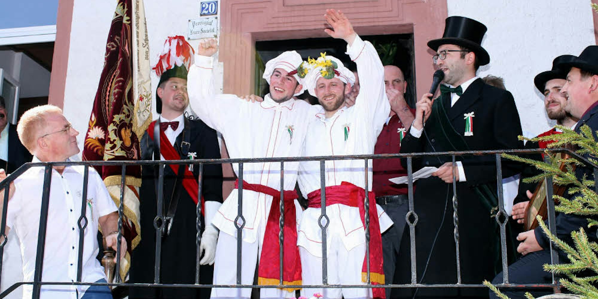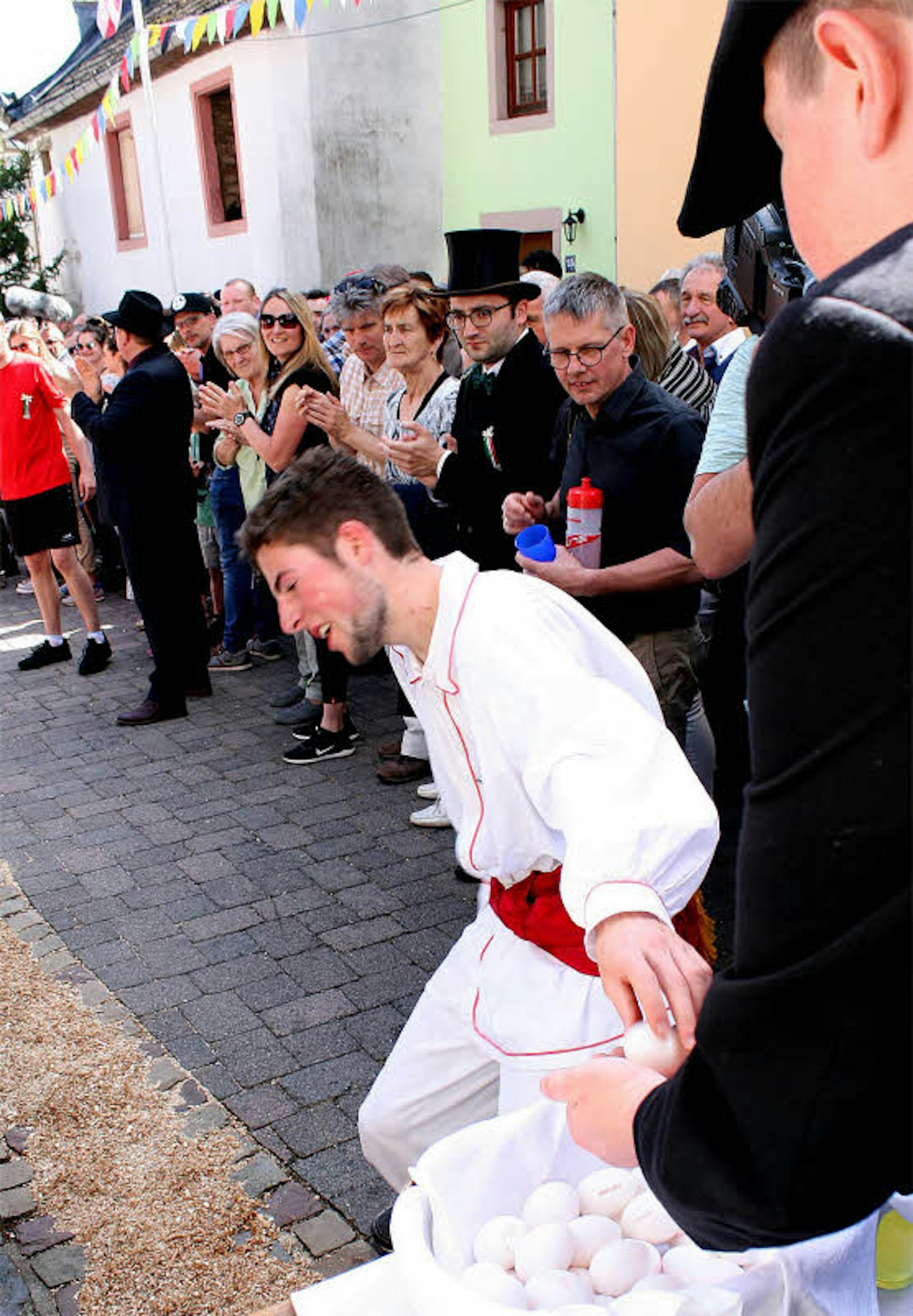 50 Jahre später ist es gegen 13.30 Uhr, als auch bei Kruft in der engen Von-Hersel-Straße vor dem ehrwürdigen Burgmannenhaus mitten in Schönecken die Spannung steigt. 104 rohe Eier sind wenige Minuten zuvor im Sägemehlbett im Abstand von einer Elle (62,5 Zentimeter) von den Honoratioren des Junggesellensodalität, wie hier der Junggesellenverein heißt, ausgelegt und mehrfach nachgezählt worden. Es ist ein Festtag: Alle aktiven Sodalen tragen feinen dunklen Zwirn und Hut. Ein schwarzer Gehrock und ein Zylinder zeichnen Hauptmann Marco Schaal und Brudermeister Thomas Ullrich aus. Die Farbe ihrer Schärpen macht sie für den Kenner unterscheidbar.