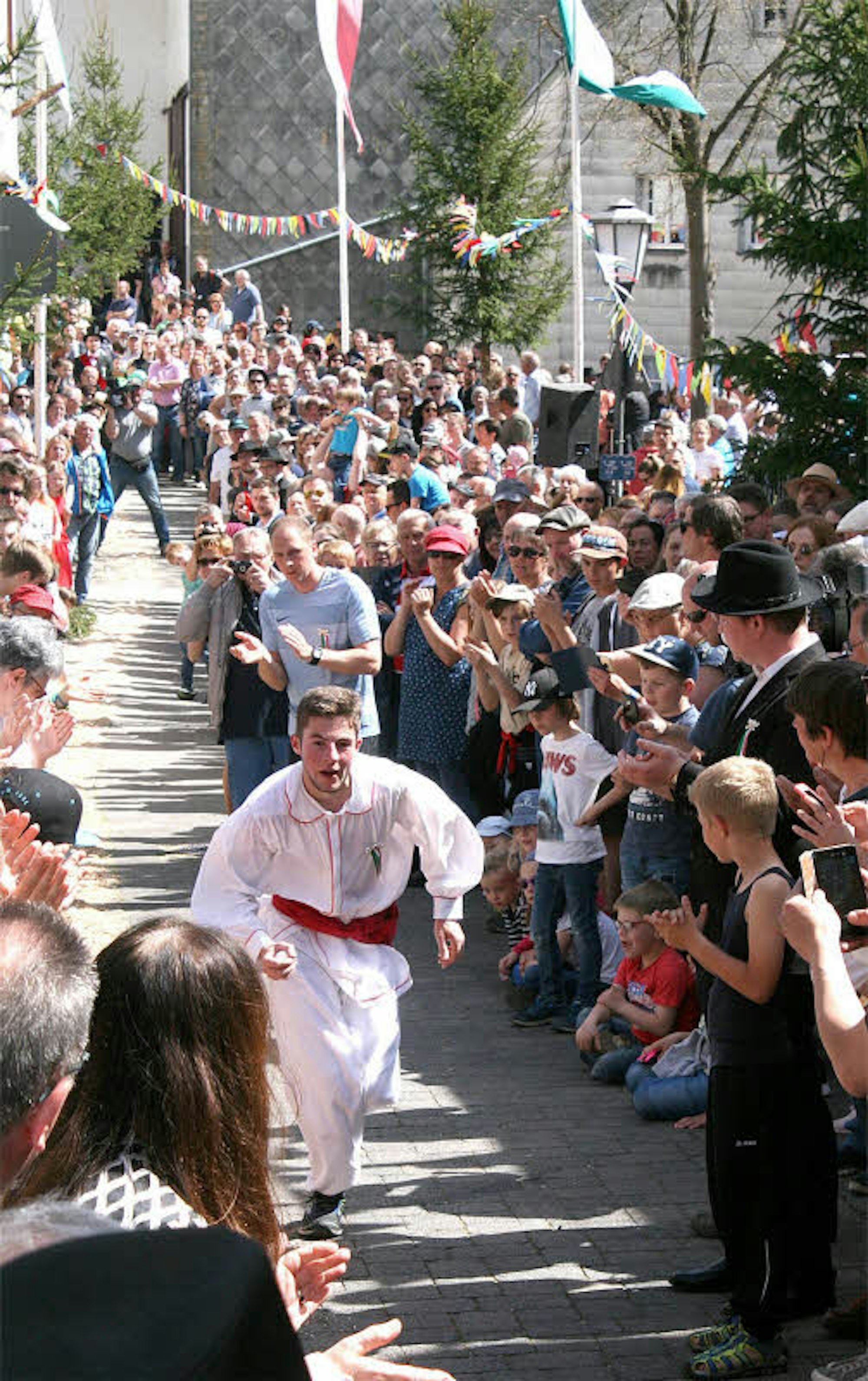 Um kurz vor 14 Uhr ist die mit bunten Wimpeln und Fahnen geschmückte Straße entlang der Strecke der 104 ausgelegten Eier mit rund 600 Zuschauern dicht gefüllt. Nur eine schmale Gasse für den Raffer bleibt frei. Es erschallt ein Böllerschuss. Julius Thiel und Christian Gitzen sind beide, wie es die Tradition will, in Weiß gekleidet. Sie geben sich den Bruderkuss an einer auf den Asphalt aufgesprühten, weißen Startlinie. Wenige Meter geht es hinunter zur Teichstraße, die durch Schönecken führt – es sind die ersten Meter für den Läufer. „Jetzt wird die Tagesform entscheiden“, sagt Klaus Kruft, der Eierlage-Jubilar.