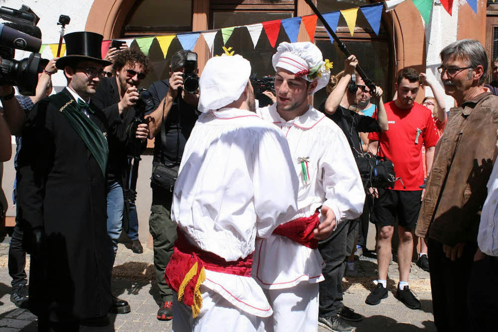 Da kehrt kurz eine gewisse Ernüchterung in einer siebenköpfigen Clique junger Schöneckerinnen im jubelnden Publikum ein. „Jetzt hat der ja auch eine Freundin!“, sind die Schwestern Helena und Sarah Arenth etwas überrascht. Die Junggesellinnen würden sich das Raffen und Laufen ansonsten auch jederzeit zutrauen – wenn sie es denn jemals dürften. In den vergangenen 255 Jahren jedenfalls nicht.