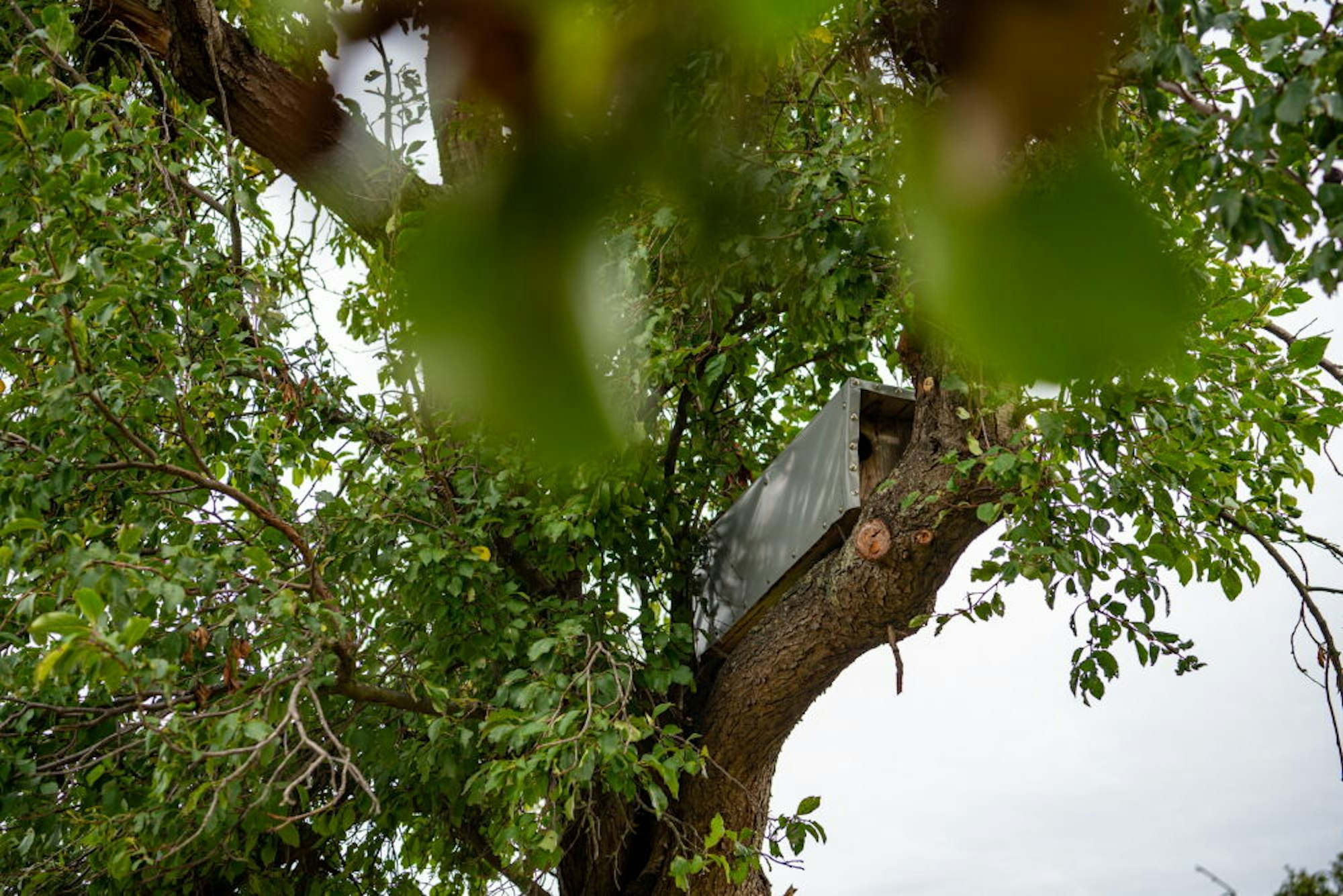 Doch seine Bäume seien noch nicht alt genug, sagt er. Astlöcher finden die Käuze hier keine. Deshalb hat Latz einen Nistkasten auf einen Baum setzen lassen – ein länglicher, grauer Kasten mit einem Loch. Innen sei die Nisthilfe s-förmig angelegt, berichtet Latz. Das soll die Steinkäuze vor Mardern schützen.