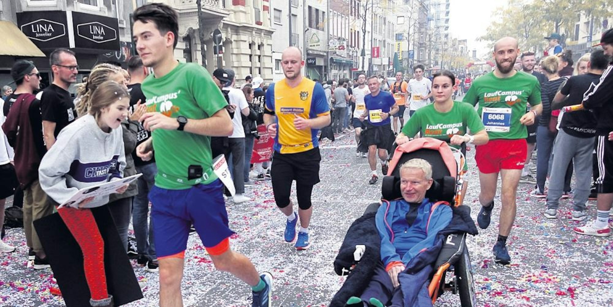 Unter ihnen war auch der Euskirchener Andreas Butz mit seinem Team vom Laufcampus, bestehend aus Johannes Mahlberg, Tim Wagner, Naemi Peselmann, Michael Heiliger und Guido Müller. Für sie sollte es diesmal ein ganz besonderer Marathon werden: Denn die Gruppe schob den ehemaligen Radrennfahrer und Marathonläufer Bruno Schmidt – er leidet an der Nervenkrankheit ALS – in einem Rolli über die Marathonstrecke, um auf seine unheilbare Krankheit aufmerksam zu machen und Spenden zu sammeln.