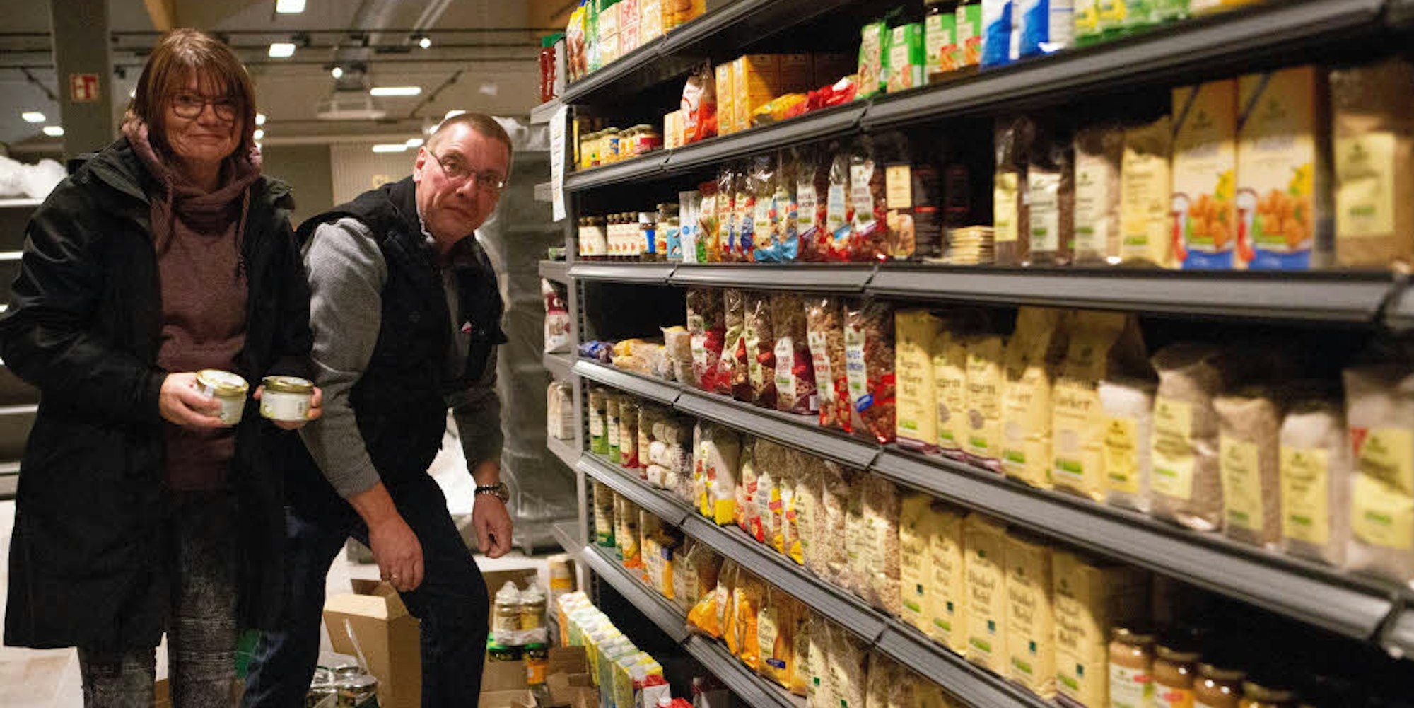 Die Betreiber des Edeka, die Eheleute Marita und Wilfried Thiele, beim Einräumen der Regale.