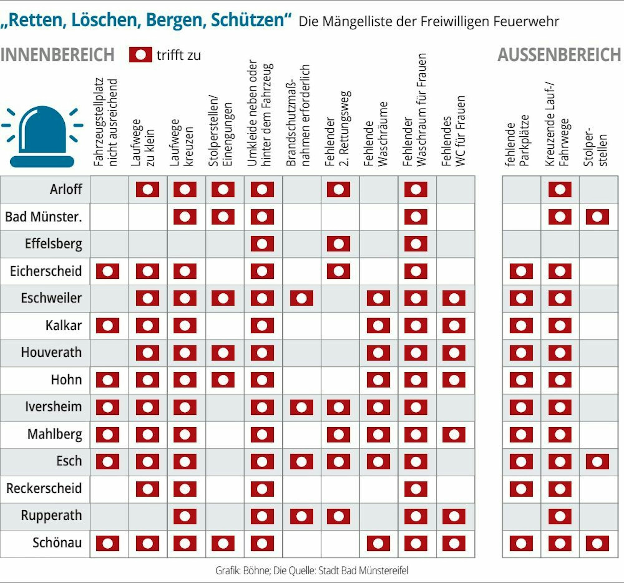Da die Fahrzeughalle nicht so umgebaut werden könne, dass die Forderungen der Unfallkasse erfüllt werden können, werde eine Erweiterung des Gebäudes erforderlich, heißt es in der Ausschussvorlage. Um die Planung der Sanierung voranzutreiben, sind im Haushalt nun 3924 Euro eingestellt worden. Gleiches gilt für das Gerätehaus in der Kernstadt von Bad Münstereifel. Dort sind knapp 6000 Euro für die weitere Planung zur Beseitigung der Mängel in den Haushalt eingestellt worden. Das, was möglich war, haben die Mitglieder der Löschgruppe teilweise schon aus eigenen Mitteln erledigt. So wurden vorstehende Bauteile und verstellte Verkehrswege beseitigt sowie Gasdruckflaschen gesichert.