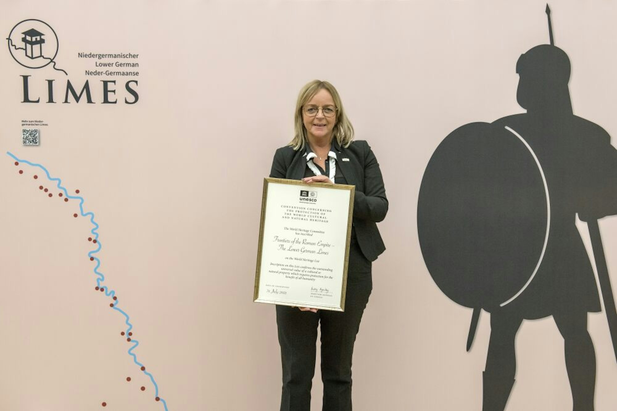 Eines dieser Schriftstücke nahm Bad Münstereifels Bürgermeisterin Sabine Preiser-Marian entgegen. Denn die Römische Kalkbrennerei in Iversheim ist Teil des Niedergermanischen Limes.