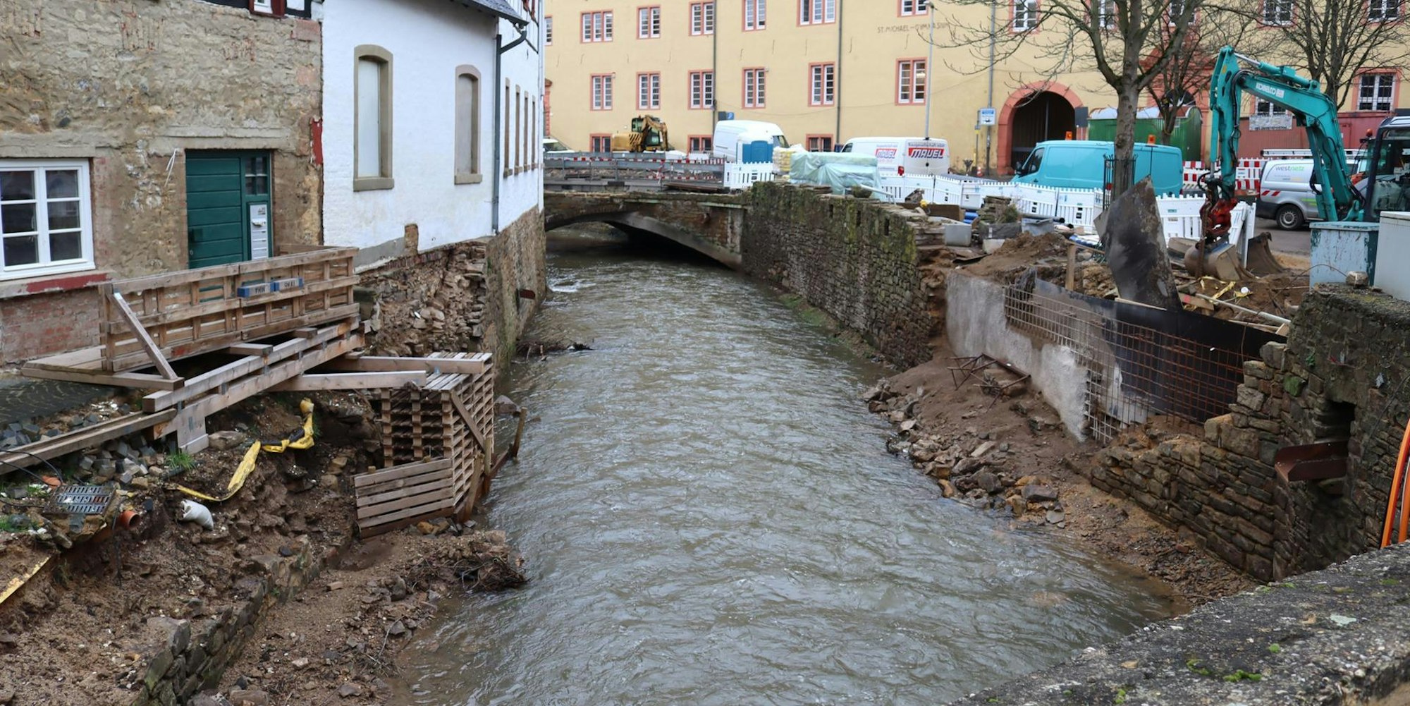 Bad Münstereifel – Fast die Hälfte der Arbeit ist geschafft. Dennoch fallen beim Wiederaufbau der Erftmauern in der Münstereifeler Innenstadt vor allen Dingen die Stellen auf, die noch fehlen. Am Salzmarkt und auf der gegenüberliegenden Seite, also an der Fibergasse, zum Beispiel. Denn dort traf das Wasser, das über die Orchheimer Straße schoss, auf das Wasser aus der Erft. Die Wucht war so enorm, dass die Erftmauer an einigen Stellen komplett fehlt – auch das Heiligenhäuschen wurde ein Raub des Wassers.