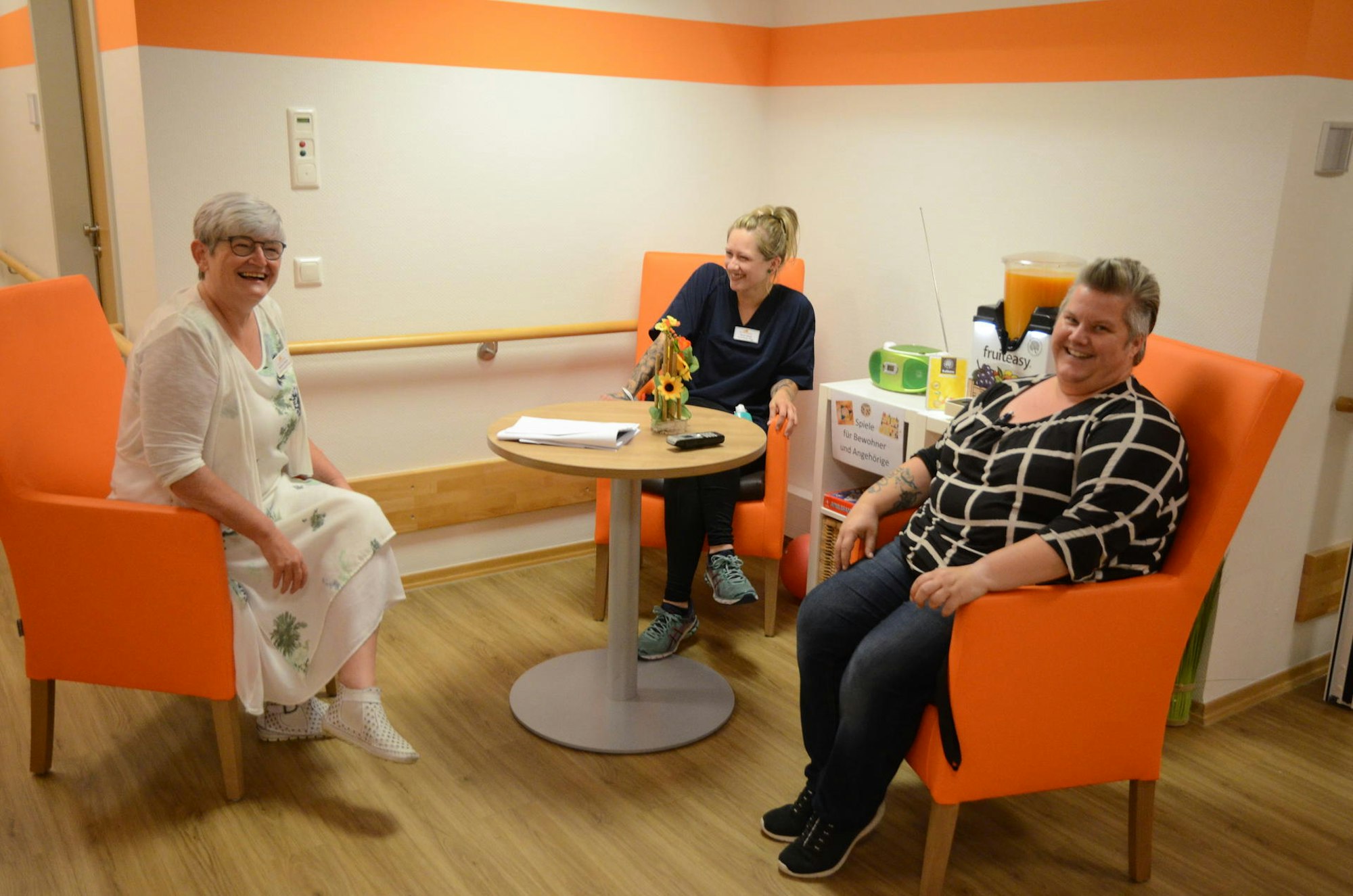 Die positive Stimmung leben Einrichtungsleiterin Marlene Helten (v.l.), Auszubildende Nevin Schön und Pflegedienstleiterin Brigitte Zimmer.