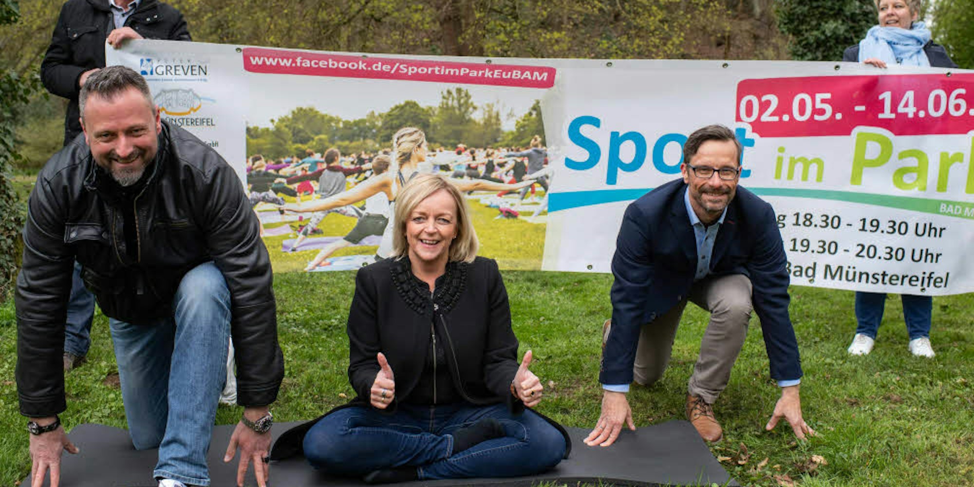 Voller Vorfreude auf Sport im Park ist Bad Münstereifels Bürgermeisterin Sabine Preiser-Marian (M.).