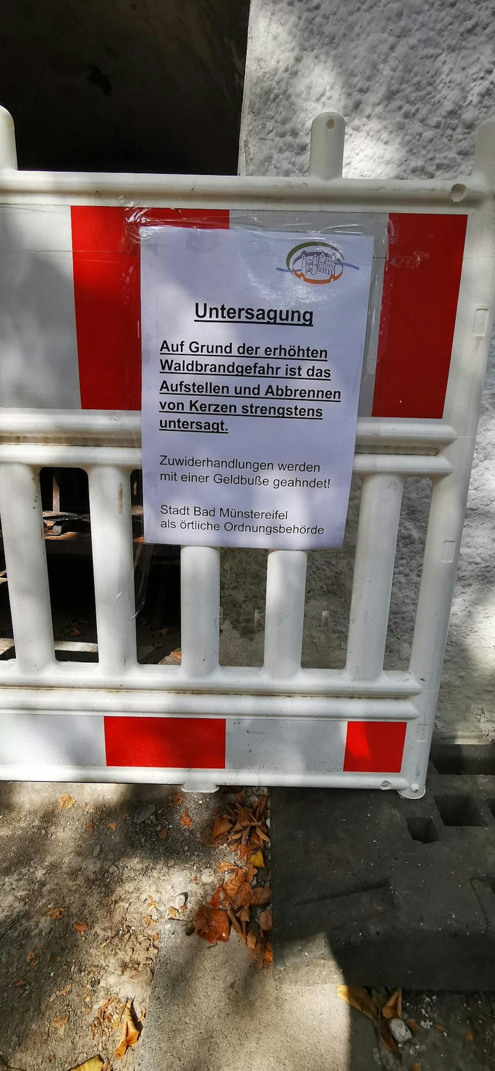 Der Waldbrandschutz obliege grundsätzlich dem Landesbetrieb Wald und Holz und dem Waldeigentümer. Neben der Sperrung des Decken Tönnes gibt es noch eine weitere Maßnahme: Der Forstbetrieb der Stadt und der Dorfverschönerungsverein Iversheim verzichten nach gemeinsamer Absprache momentan auf den Verkauf und das Aufstellen von Kerzen am Antoniuskapellchen am Friedwald in Iversheim.
