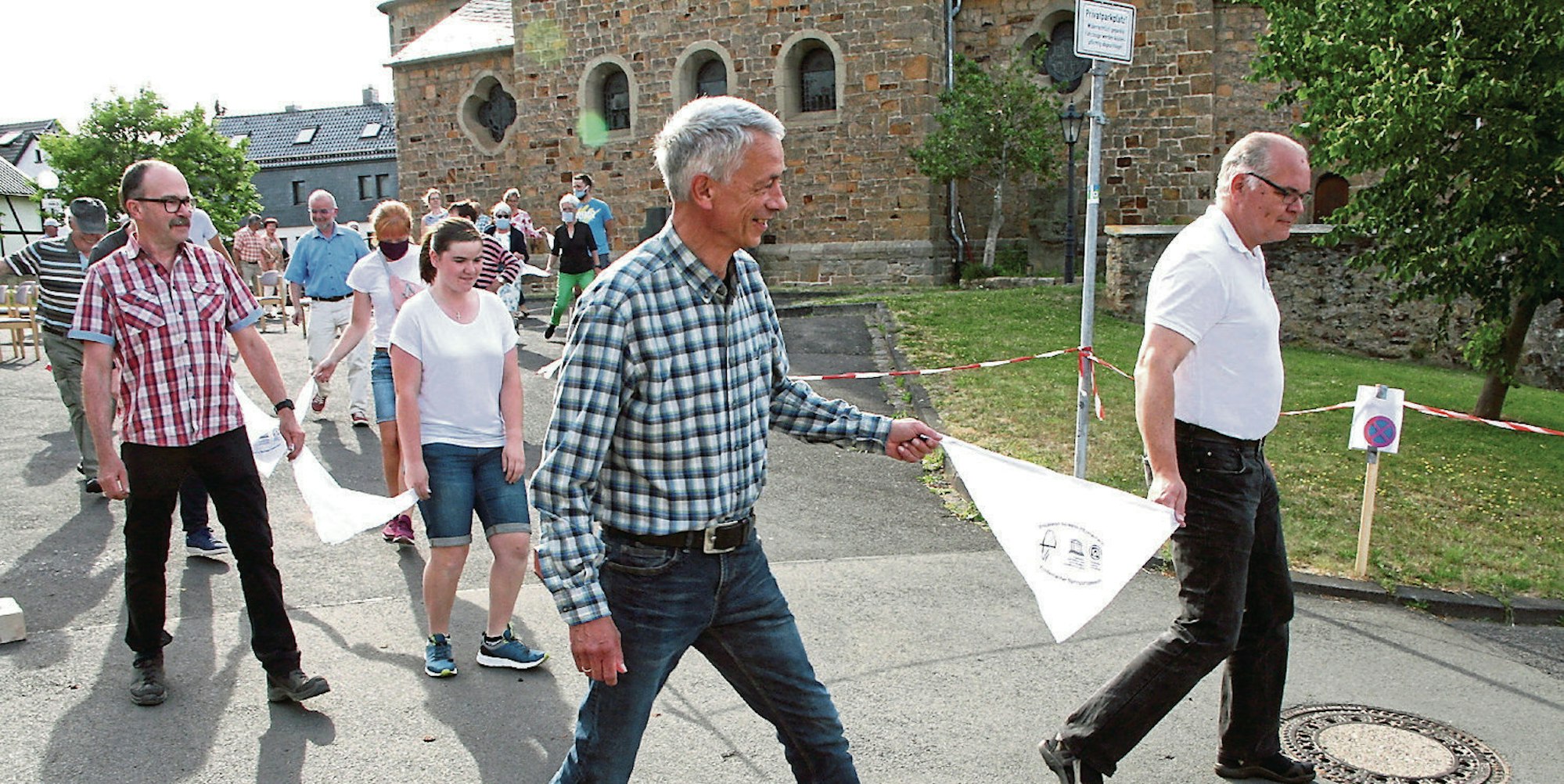 Also waren die Teilnehmer an der Nöthener Springprozession gebeten worden, wie in Echternach entweder ihre weißen Pilgertücher oder alternativ weiße Stofftücher mitzubringen. Man knotet die Enden zusammen, ein Ende nimmt der Nebenmann oder die Nebenfrau, zu fünft wird eine Springerreihe gebildet. Nebenbei bleibt so in Nöthen auch der Corona-Sicherheitsabstand von 1,5 Metern gewahrt.
