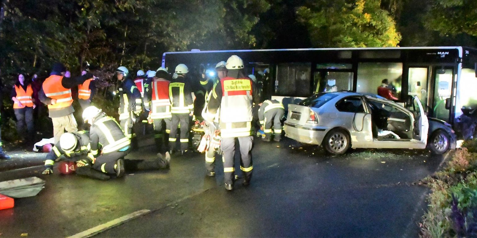 Doch das Blut war künstlich, das Szenario ausgedacht, zu großen Teilen organisiert von Andreas Zimmer aus Mahlberg. Die Feuerwehren des Münstereifeler Höhengebietes und der Rettungsdienst sollten sich in einer unübersichtlichen Lage zurechtfinden: Das Führungspersonal musste die richtigen Entscheidungen treffen, die Wehrkräfte eingeklemmte Personen fachlich korrekt befreien, der Rettungsdienst Verletzte nach der Schwere der Blessuren einordnen – und das alles bei aufkommender Dunkelheit, die es erforderlich machte, dass die Einsatzstelle ausgeleuchtet wird. Es ging in dieser Großübung am Freitagabend auch darum, die Kommunikation zwischen Rettungsdienst und Feuerwehr, aber auch zur Rettungsleitstelle zu verbessern.